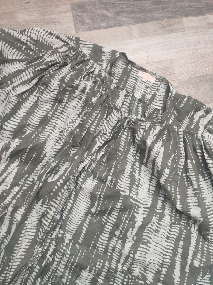 Blouse verte imprimée – Taille L – 5 € Blouse fluide à manches longues, couleur vert kaki avec imprimé blanc. coupe ample et confortable. Très agréable à porter, parfaite pour la mi-saison ou le quotidien. ✔ Taille L ✔ Très bon état ✔ Style casual / bohème ✔ Facile à associer avec un jean ou un pantalon clair Prix : 5 €