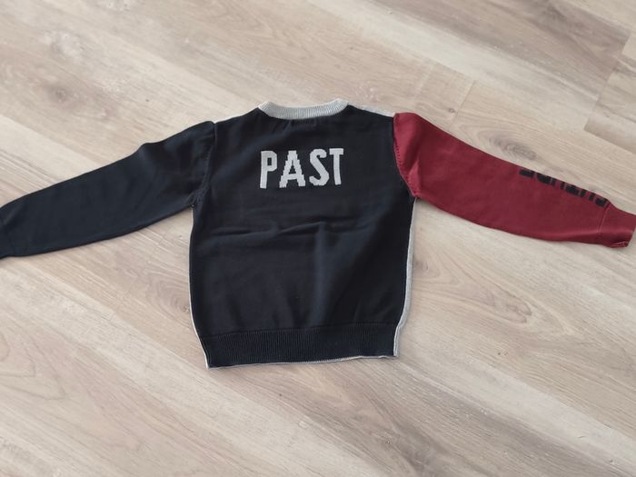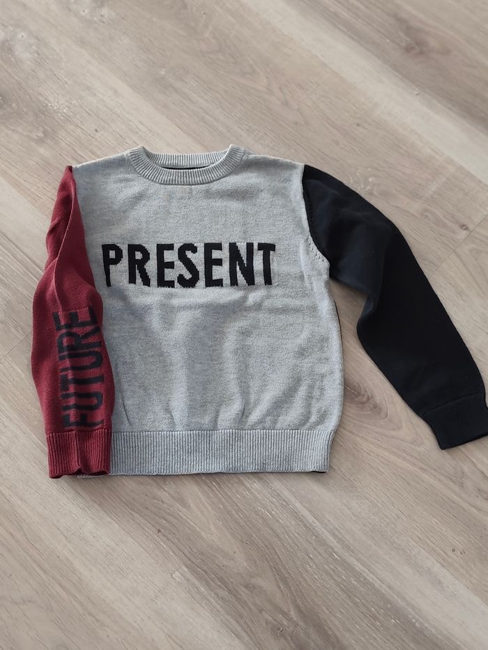 Je vends ce pull de la marque INFLUX pour enfant. - Type de produit : pull - Marque : Influx - Taille : 5-6 ans, étiqueté 6 ans mais je trouve qu'il taille un peu petit c'est plutôt du 5 ans - Couleur : gris sur la face avant, noir sur la face arrière, une manche noire, une manche bordeaux - Caractéristique : texte "PRESENT" sur la face avant, "PAST" sur la face arrière et "FUTURE" sur la manche droite.