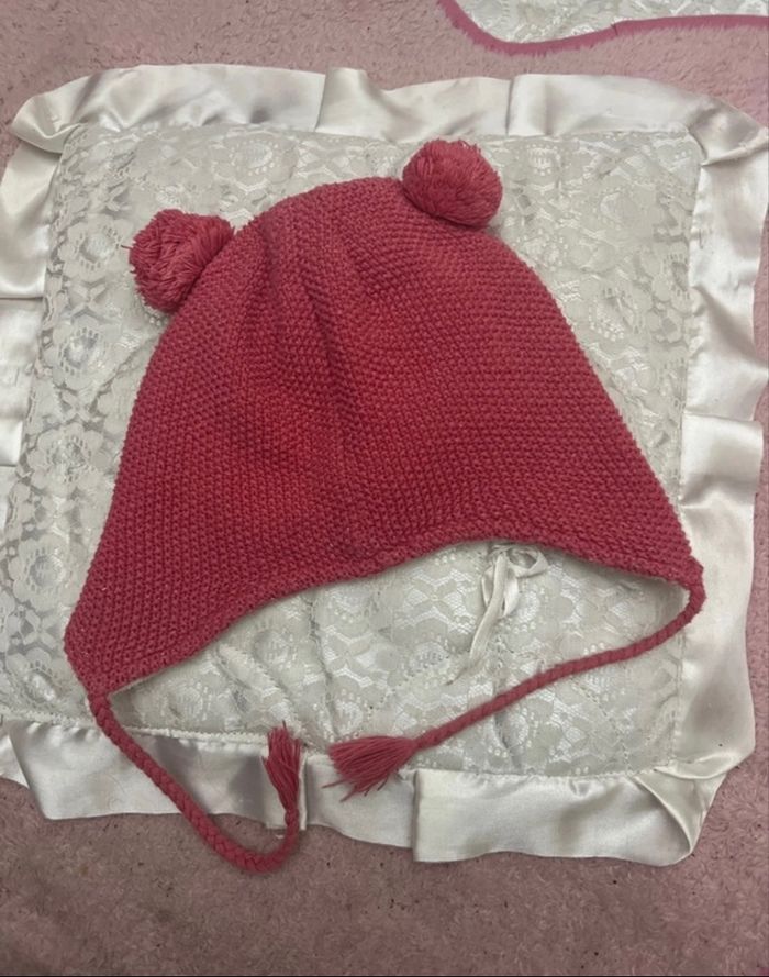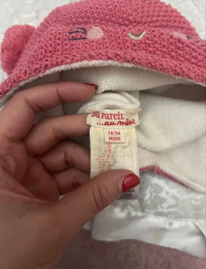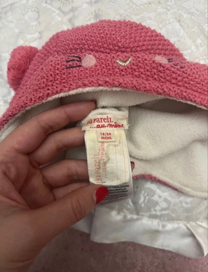 Bonnet Marque « Du Pareil au même « taille 18/24 Mois en très bon état identique aux photos, posté de couleur rose intérieur beige, 57 % coton, 34 % acrylique 6 % polyester #bonnet #bonnetbebe #dupateilaumeme #vêtements #entresbonetat