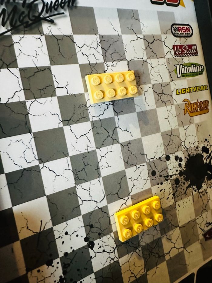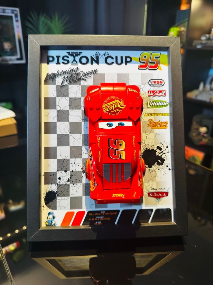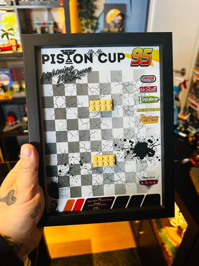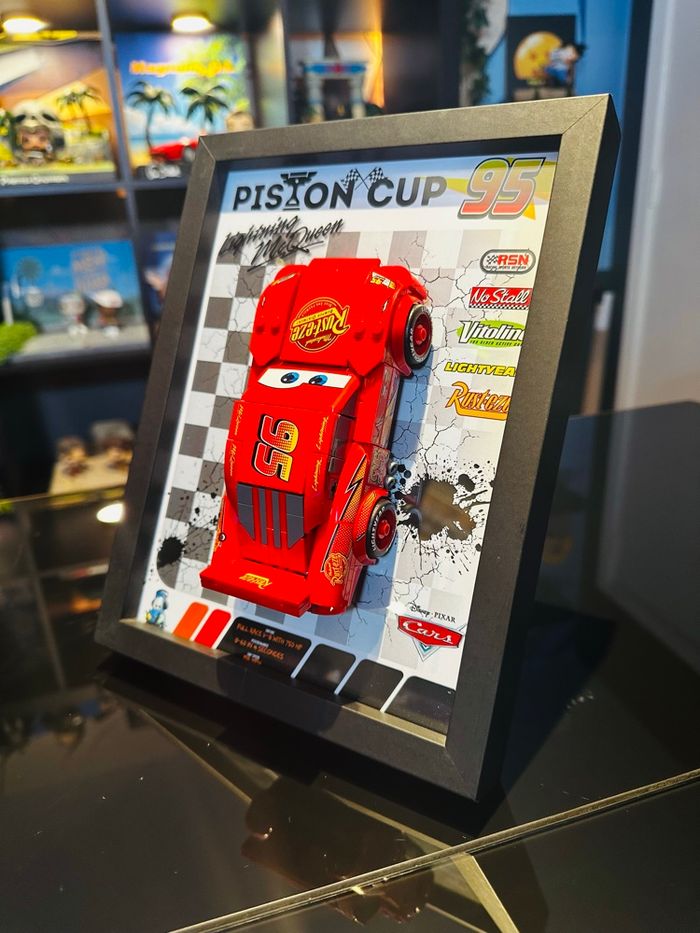 Cadre noir 18×24 cm • Fond imprimé chez un imprimeur papier 200 gr. • Petites pièces plate 2×6 collées au fond pour clipser directement votre voiture des réception • Vitrine murale ou a poser • Installation simple et propre Informations importantes : • Compatible avec la voiture LEGO Flash McQueen • Vente du cadre uniquement, aucune voiture supplémentaire fournie Idéal pour la mise en valeur d'une collection ou une déco geek / cinéma • N'hésitez pas à me contacter pour toute question ou pour voir mes autres créations. Envoi rapide et emballage très soigné.