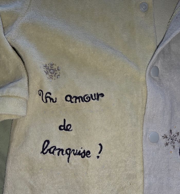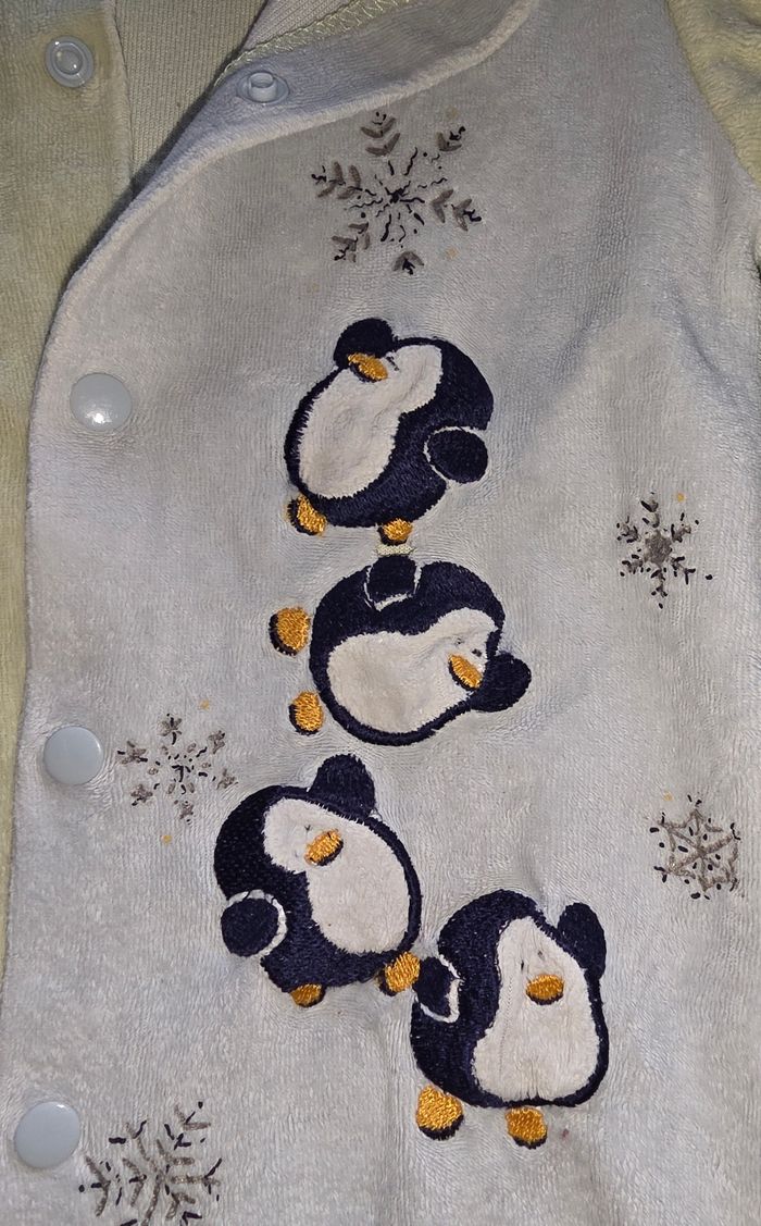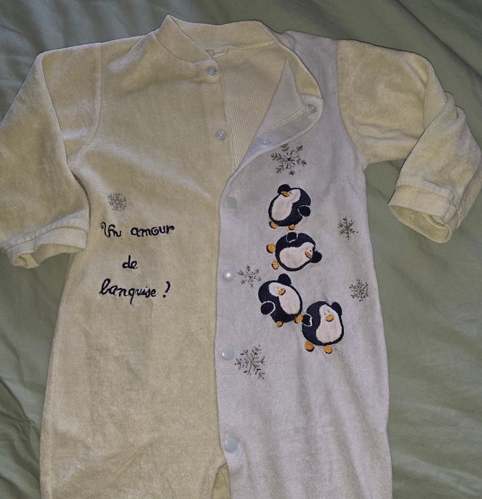 Pyjama en velours une pièce. Couleur bleu/vert motifs pingouins. Marque inconnu en 12 mois. Remises sur lots activé ✅️ De plus, moins de frais de livraison 🪙📦 Envois rapide et soigné ! 🚚
