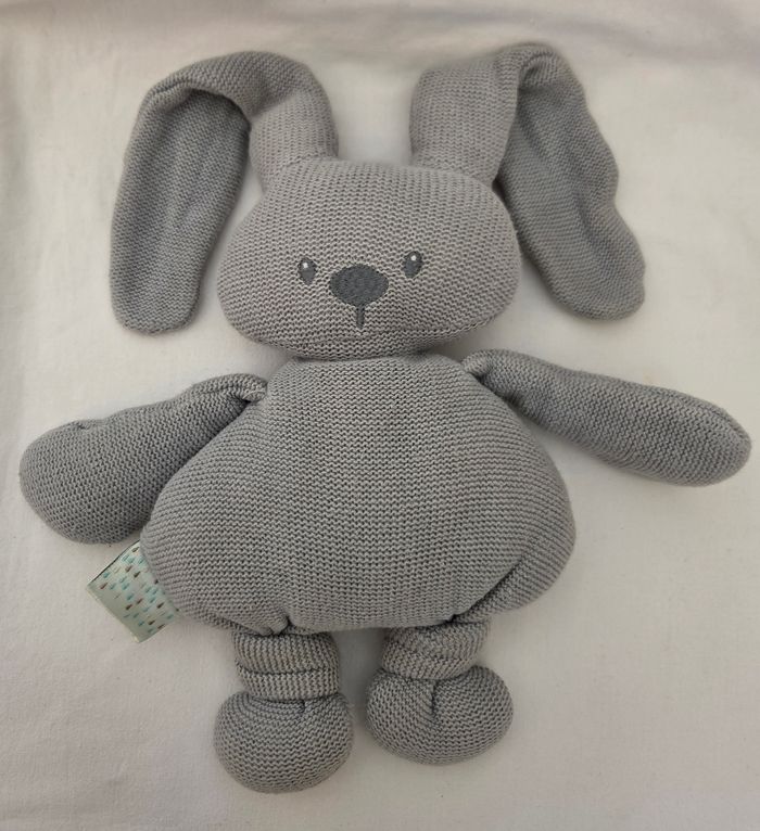 Doudou peluche Lapin Lapidou en tricot de couleur gris . Visage brodé de fil de couleur gris. Noeud sur les jambes . Lapin qui mesure 25 cm env ( mesure sans mesurer les oreilles)