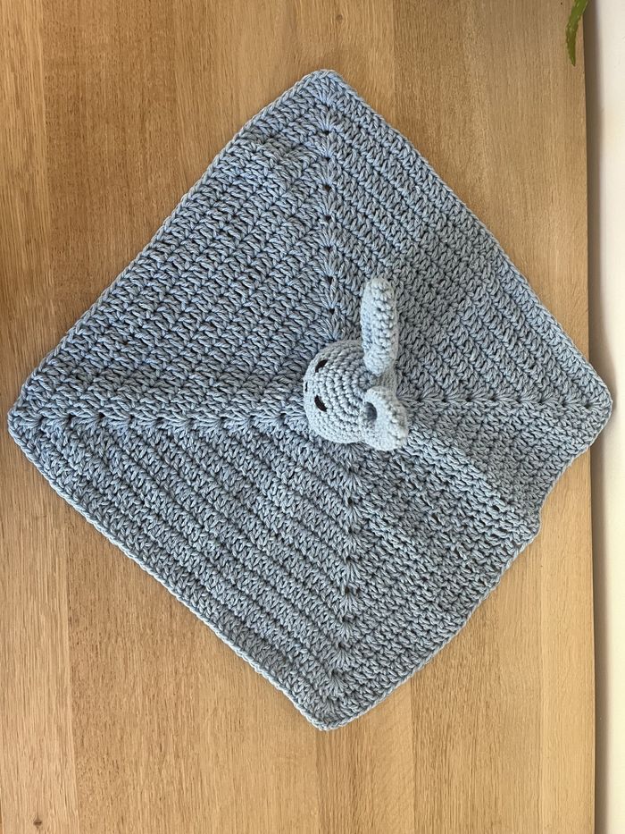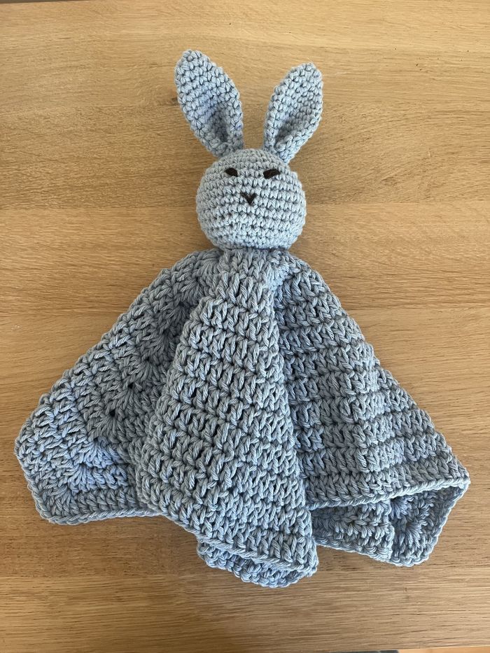 Je suis un doudou carré de 35 cm, crocheté avec du coton, mes yeux et ma bouche sont brodés, ma tête est solidement cousue à mon corps et rembourrée en polyester. Sur l'un de mes coins, j'ai une boucle qui permet d'accrocher la tétine de bébé.
