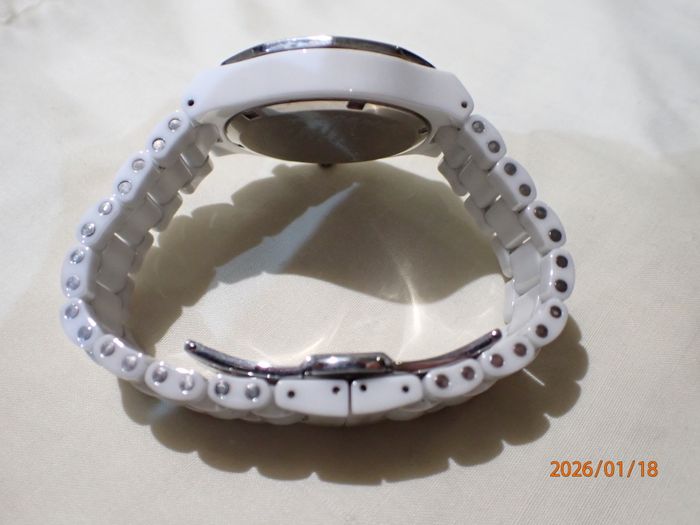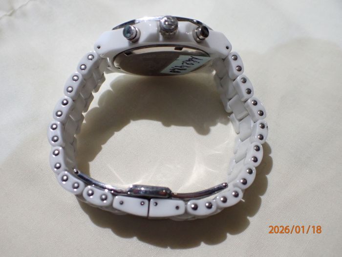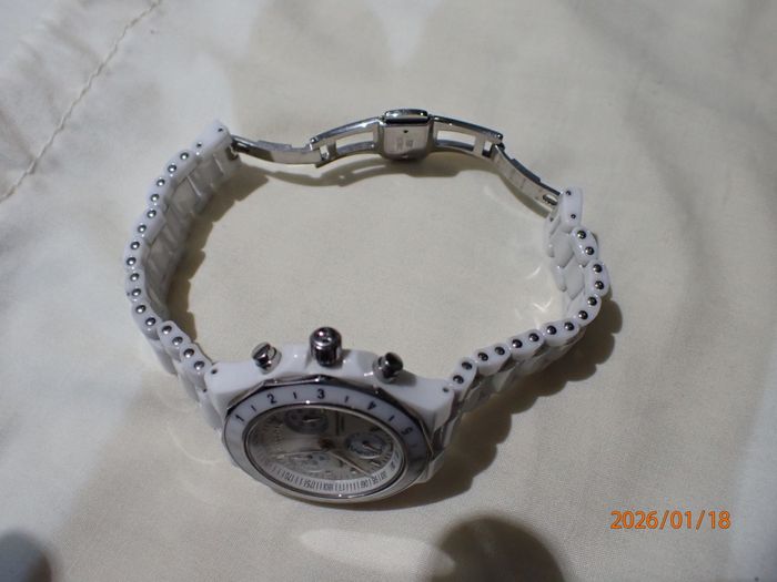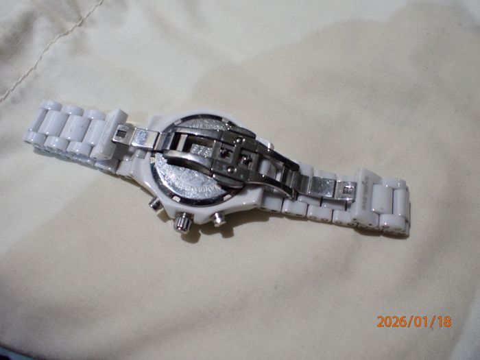 EN DETAIL ; MONTRE SUISSE ANDLOVE DAMES/FILLES EN CERAMIC VERRE SAPHIR ,GUICHET DATE ET JOURS MOIS ,CHRONO A POUSSOIRS ,VALEURS TACHYMETRIQUE DES Km Hrs jolie présentation féminine a cadran signature Andlove gravé Suisse, Saphir, Céramique et chronographe, celui-ci incluant 3 mini cadrans annexes chrono et jours mensuel plus une fonction tachymètre boitier en céramique muni de 2 poussoirs des fonctions chronographe aiguilles bi teinte à fine trotteuse, index à gros repères , graduation des minutes , valeurs tachymètre en talus biseauté , lunette gradué à facettes déco, mise à l'heur par tirage du Bt strié logoté à 2 positions à blocage sécurit par vissage ( 1 cran pour la date et l'autre pour les Hrs) bracelet céramique de 17,5 mm à maillons démontable pour son ajustement à chaque poignet et sa boucle papillon sécurit signé en parfait état fond acier chromé vissé , siglé & W-R 10 ATM, et grave Andlove international since 1908 , wuizerland ,high Techcéramics ,glass saphir mouvement quartz suisse ISA de 3 rubis (far east ass'y) de fiabilité helvétique sans surprise son observation atteste une parfaite tenue d'heur ponctuel , livrée avec une pile neuve en place , état visuel général d'exception proche du neuf, le fond à quelques infimes tracettes superficielles mineures photos et info sur simple demande