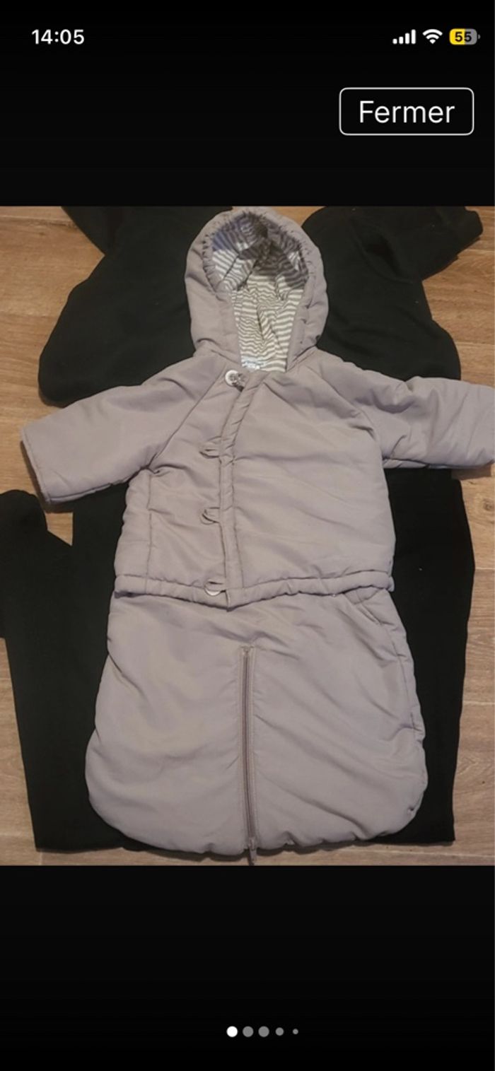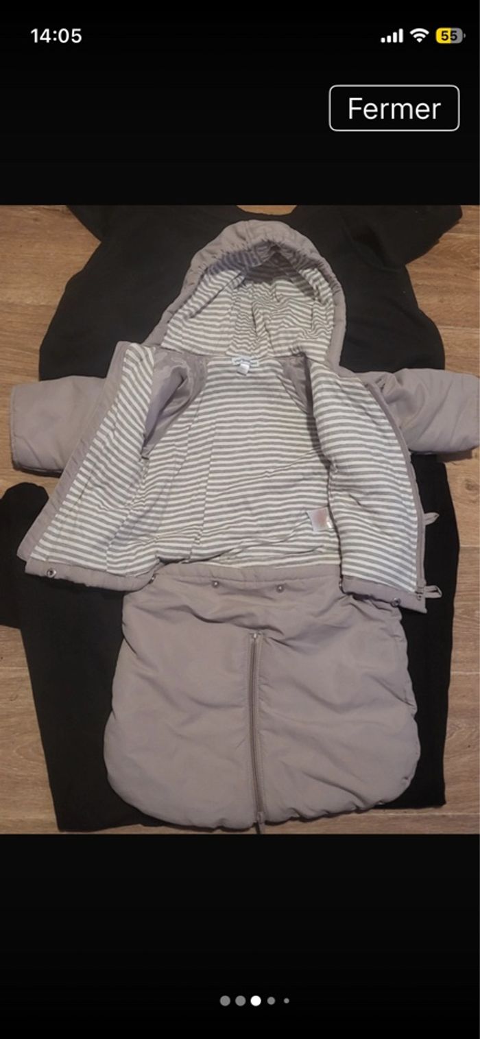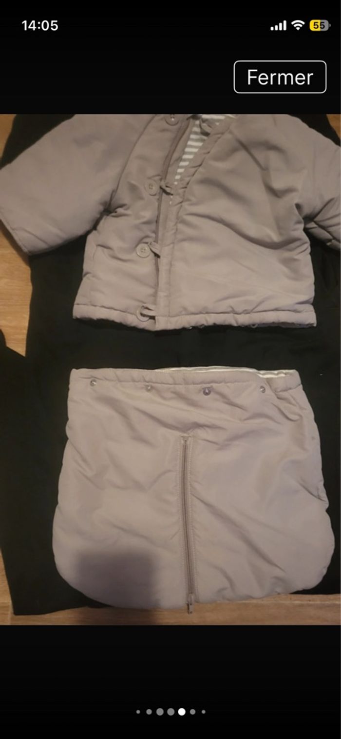 Combinaison pilote 4 en 1 de couleurs crème et marque ver baudet.le haut se défait en menteau.et le bas se met en plies lier ou sépare par fermeture éclair. Laissez passer les accroche de la poussette.envoie rapide si intéressé