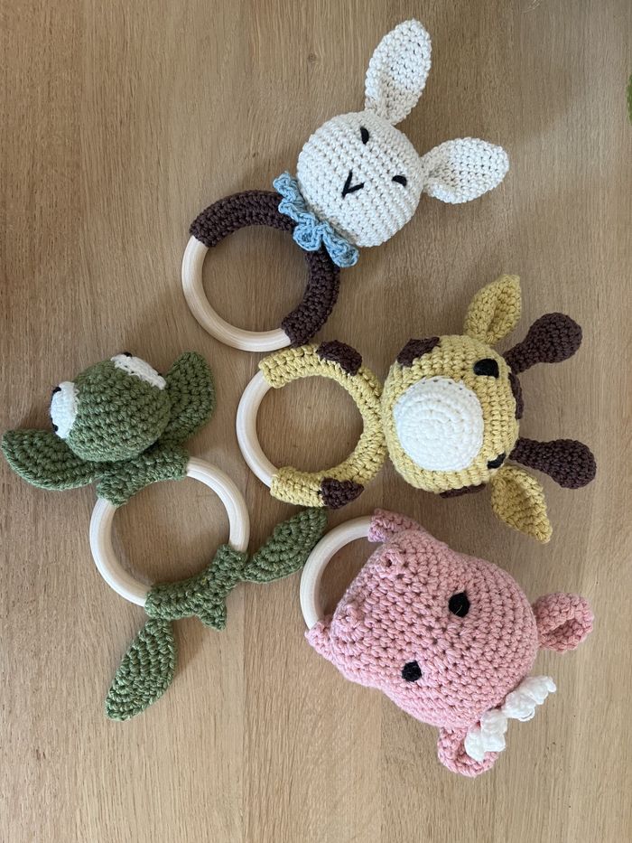 Anneau de dentition tortue pour bébé réalisé au crochet en coton. Anneau en bois de 8 cm de diamètre. Différents modèles disponibles si vous parcourez ma boutique !