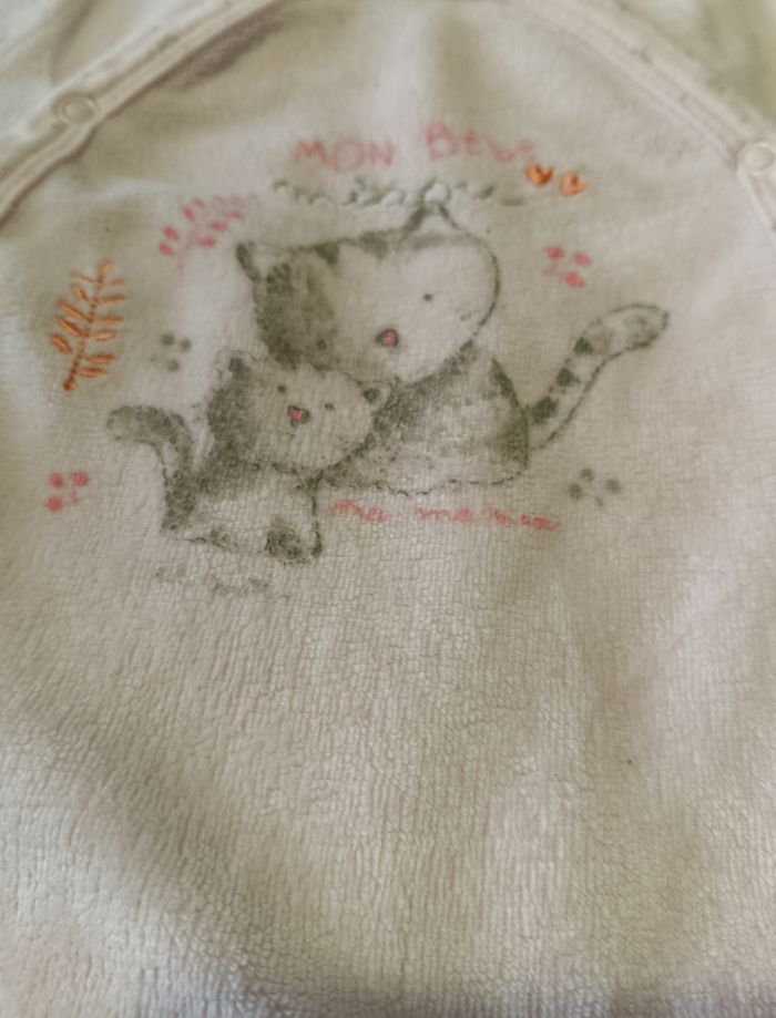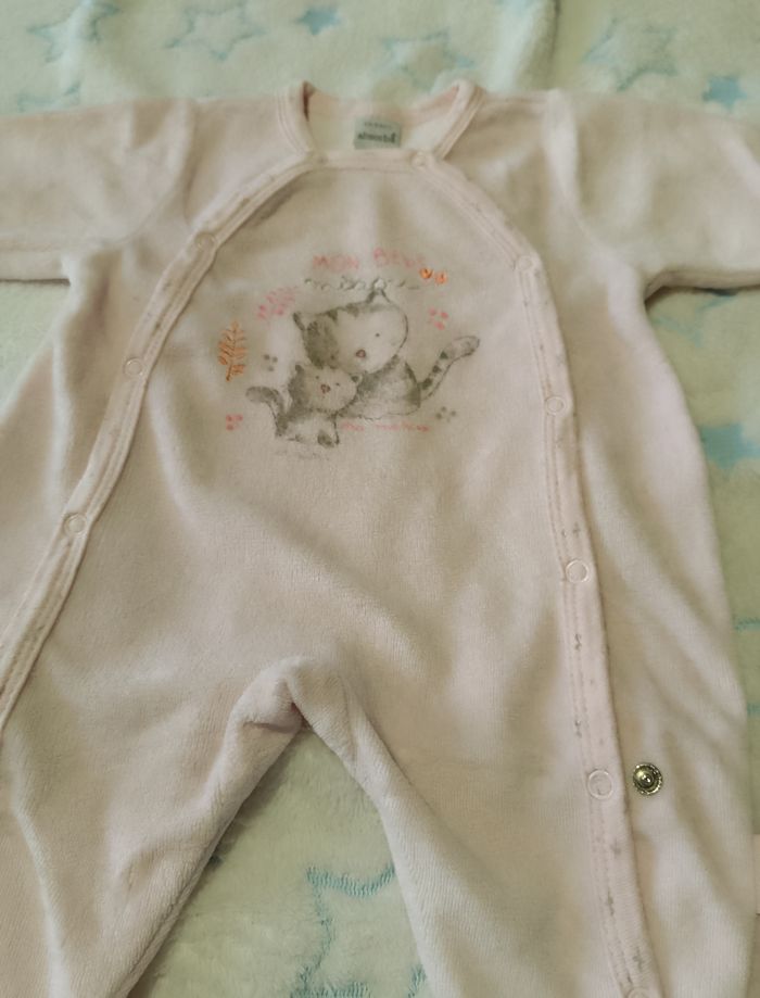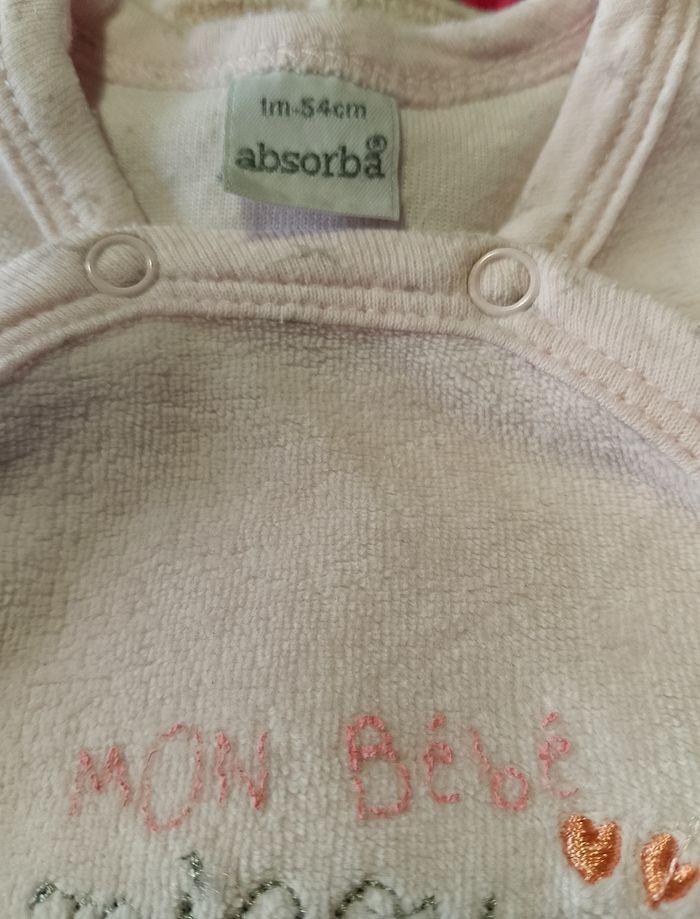 Adorable pyjama 1 mois / 54 cm, de la marque Absorba, en bon état, idéal pour les premières semaines de bébé 🐱💕 🍼 Détails : Pyjama rose avec motif chat Inscription « mon bébé miaou » Ouverture par l’avant (très pratique pour l’habillage) Taille : 1 mois – 54 cm ✔️ Aucun trou ✔️ Aucune tache Prix :3€