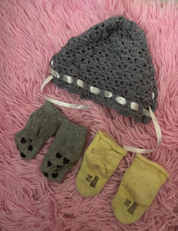 Bonnet en laine naissance cousu à la main, en très bonne état identique aux photos, posté de couleur grise, matière 100 % laine, ainsi que 2 petites paires de chaussettes de naissance Marque tex couleurs grise et jaune . En bonne état pareil identique au photo. #bonnet #laine #tex #bébé #chausette