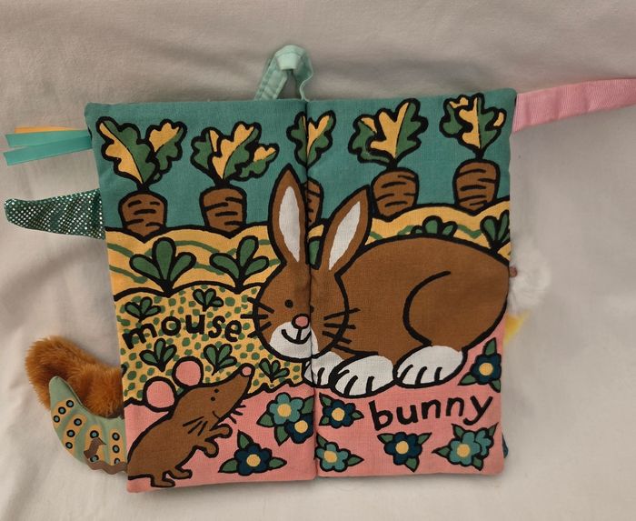 Livre en tissu de différentes couleurs , textures . Bruit de papier froissé sur le devant et l'arrière du livre. Queue de l'animal sur chaque page , etiquettes rubans pour l'oiseau, velours jaune pour le canard , boule en velours blanche pour le lapin ...... Liens a scratch pour l'accrocher ou vous le souhaiter.