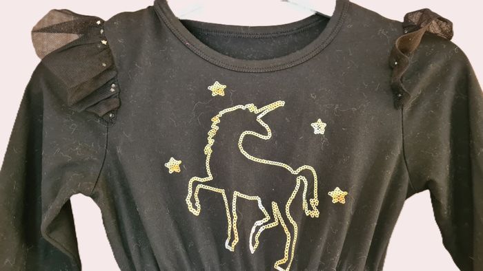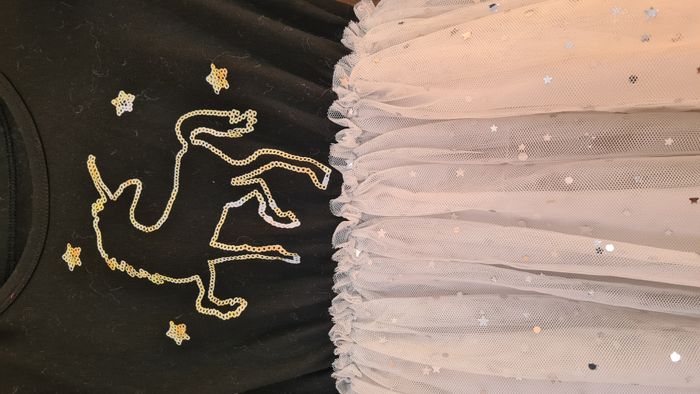 Robe fille 6 ans, motif licorne, jupe doublée avec tulle étoilé couleur blanc, haut noir. Très bon état.