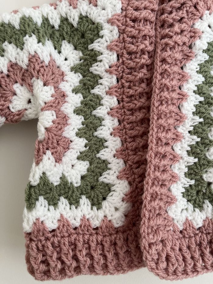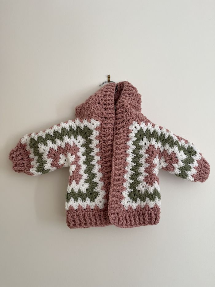 veste à capuche au crochet fait main pour 12 mois , tout doux et chaud pour bébé. Largeur 28 cm tour de buste 56 cm hauteur 26 cm