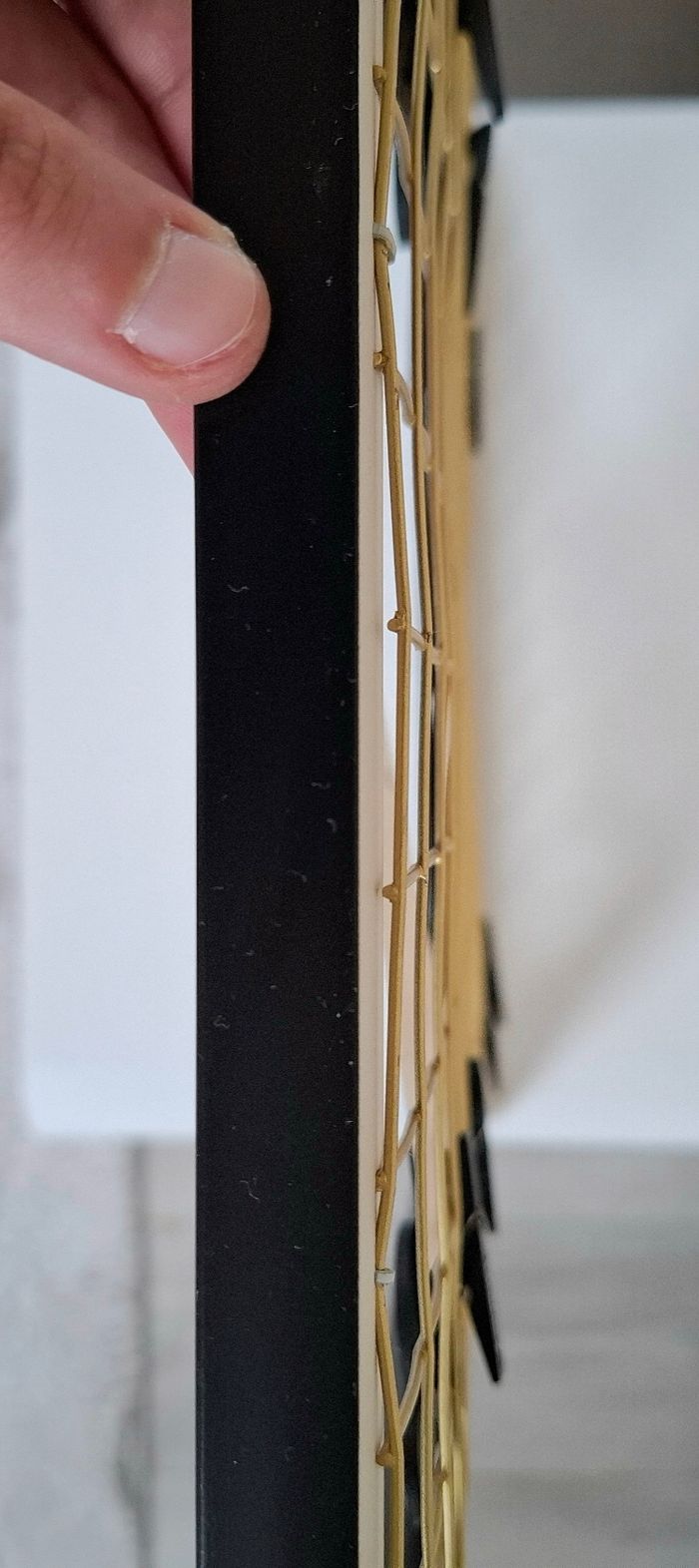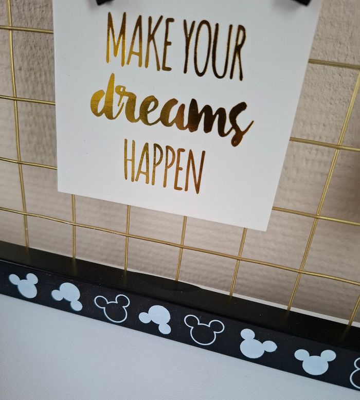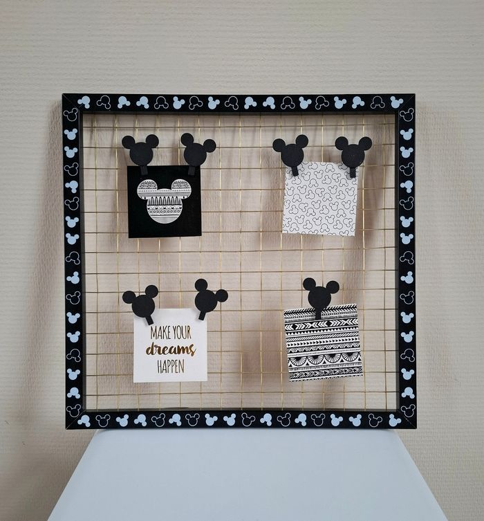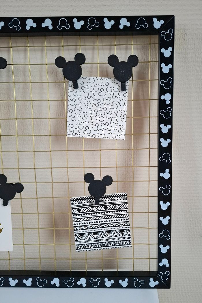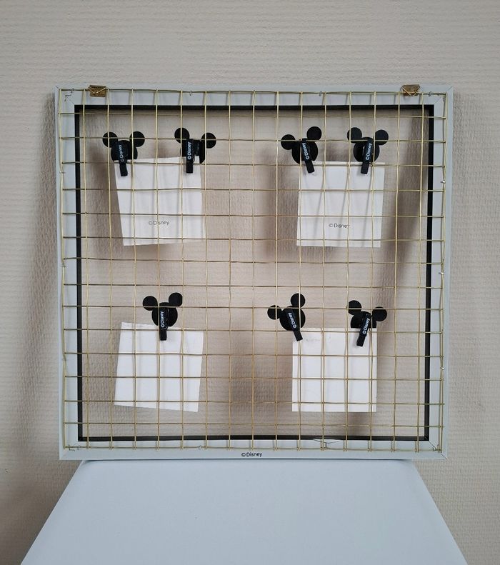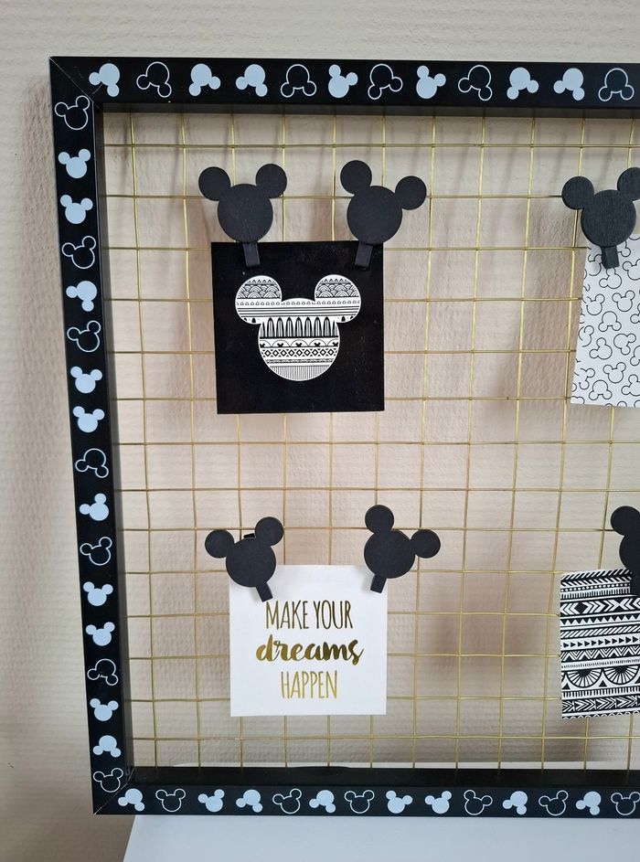 Je vends un cadre photo pêle-mêle Mickey Mouse (Disney) venant de chez Primark. Il est de couleur noir et blanc avec du doré. Il possède 7 pinces en bois en forme de Mickey pour accrocher des photos (Une pince à été perdue). Le fer doré présente quelques défauts : plus droit à certains endroits; principalement sur le contour et présente un défaut sur le derrière dans le bas mais ne gêne en rien l'utilisation (Voir photos). Reste en très bon état. Dimensions : 40 cm de hauteur - 42 cm de largeur et 1,5 cm de profondeur.