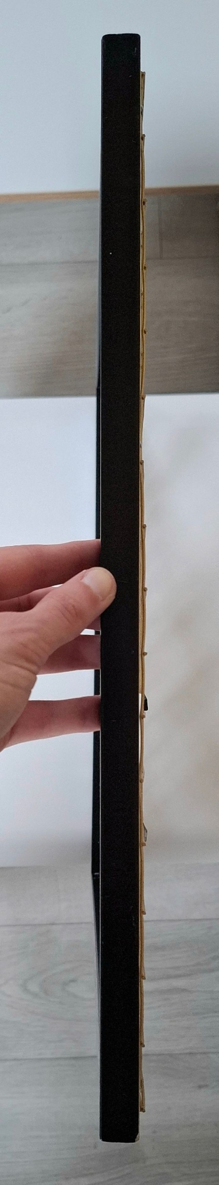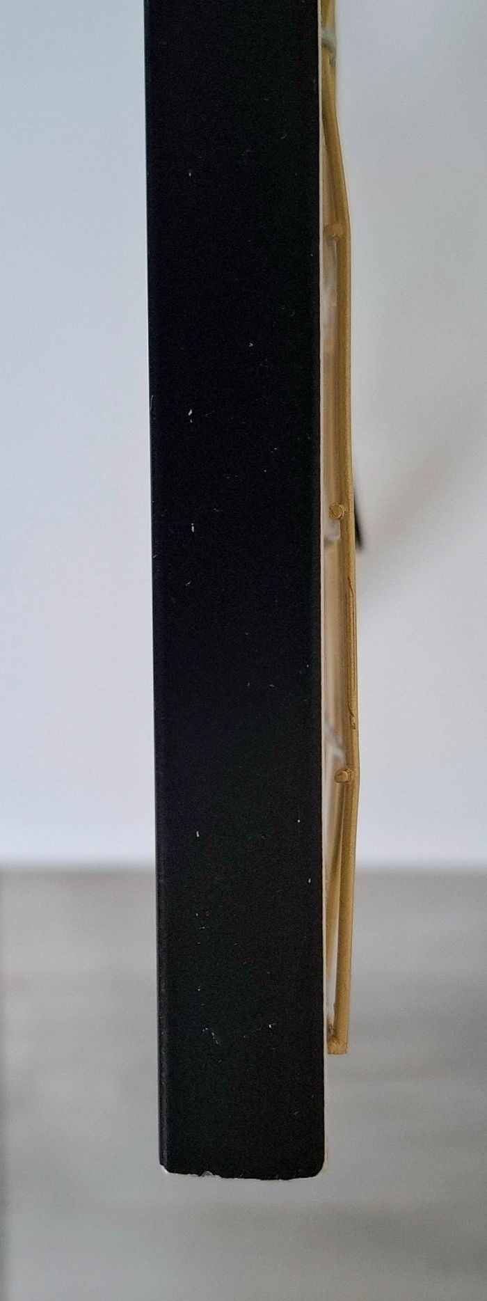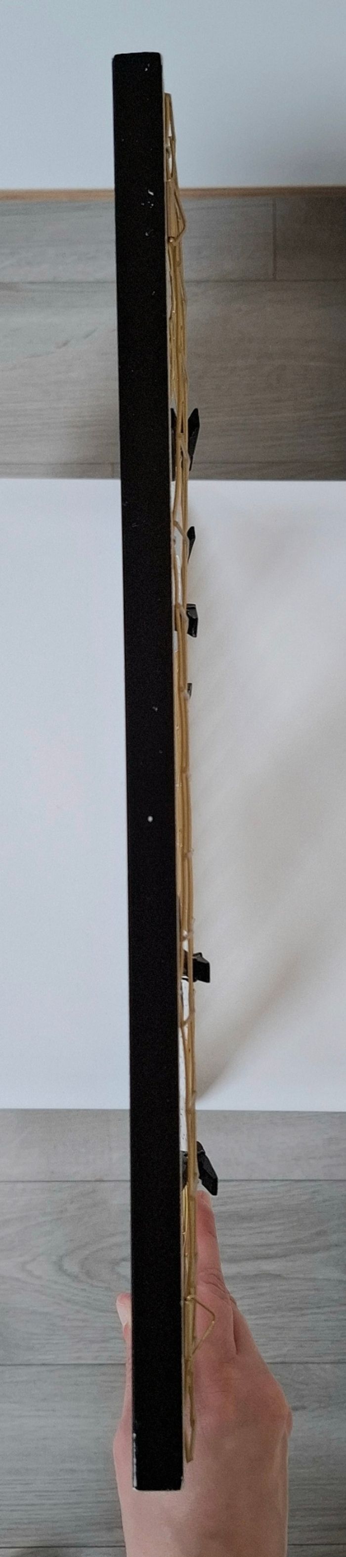 Je vends un cadre photo pêle-mêle Mickey Mouse (Disney) venant de chez Primark. Il est de couleur noir et blanc avec du doré. Il possède 7 pinces en bois en forme de Mickey pour accrocher des photos (Une pince à été perdue). Le fer doré présente quelques défauts : plus droit à certains endroits; principalement sur le contour et présente un défaut sur le derrière dans le bas mais ne gêne en rien l'utilisation (Voir photos). Reste en très bon état. Dimensions : 40 cm de hauteur - 42 cm de largeur et 1,5 cm de profondeur.