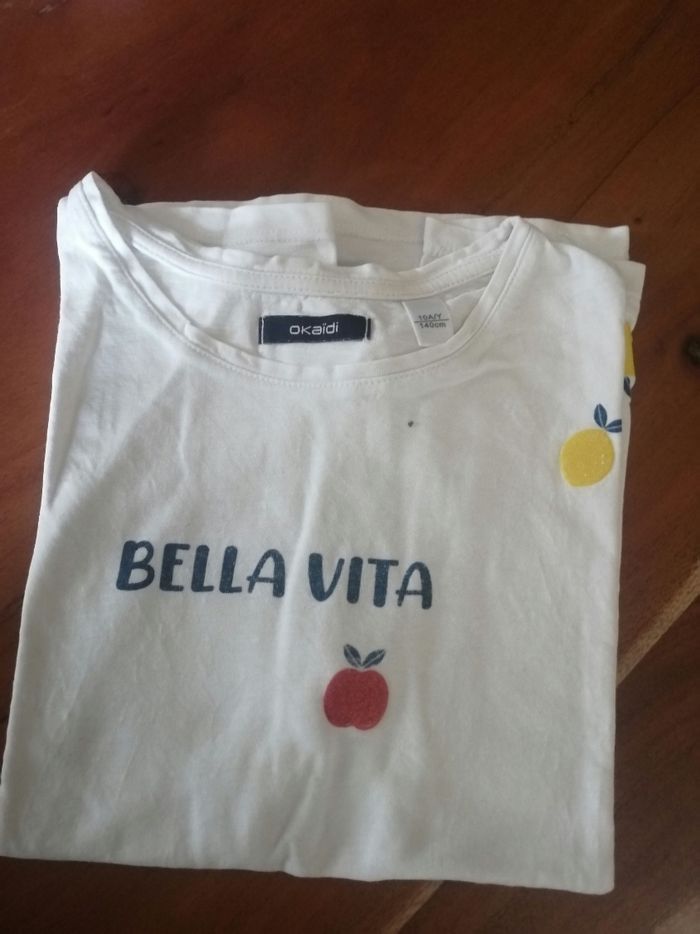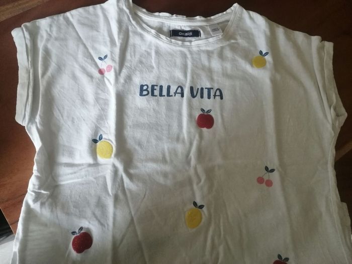 Tee shirt ,fille 10ans ,fond blanc imprimé Bella vita et de de fruits rouge et rose, Okaidi