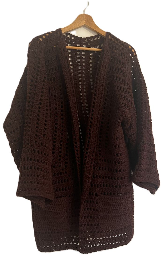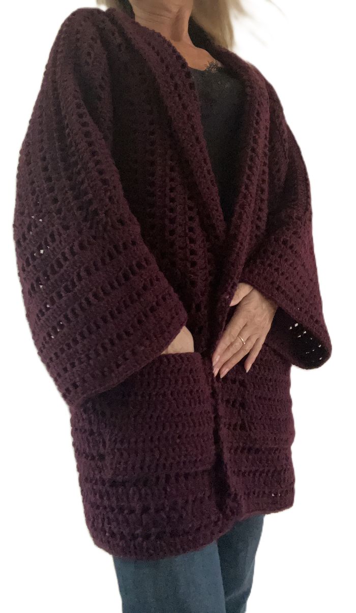 veste longue hyper tendance réalisée au crochet en acrylique certifié Oeko tex. avec 2 poches. dimensions : hauteur 83 cm (32,8 pouces) largeur 55 cm (21,8 pouces)