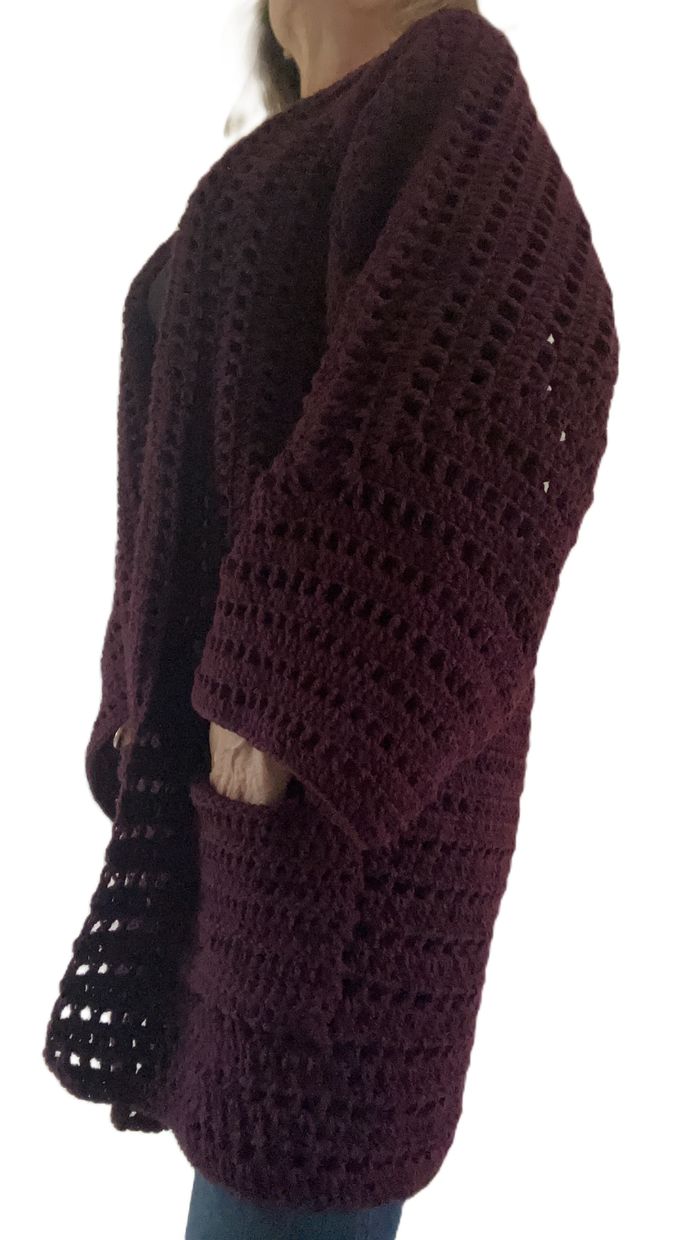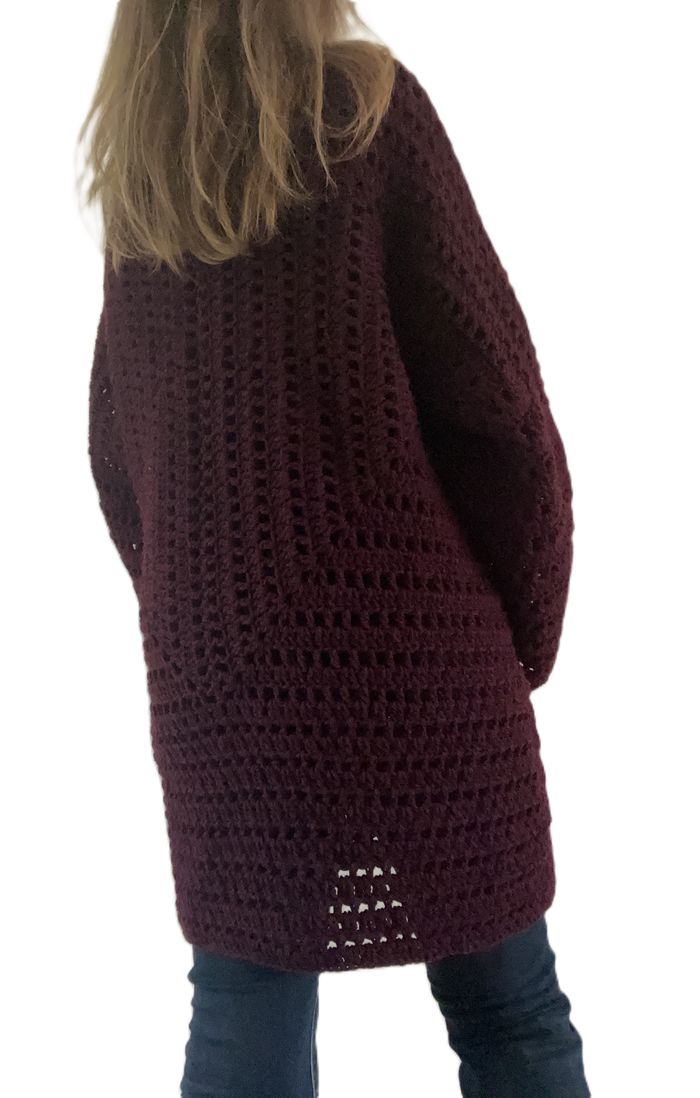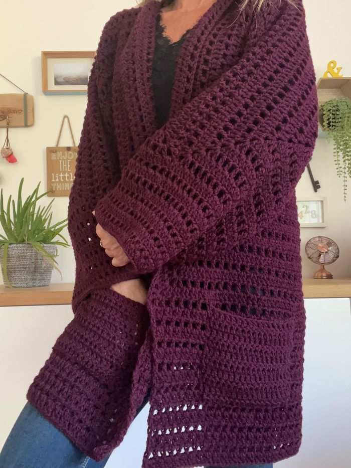 veste longue prune au crochet fait main