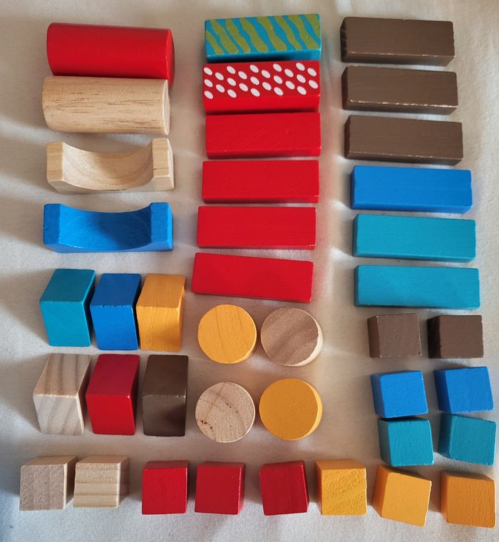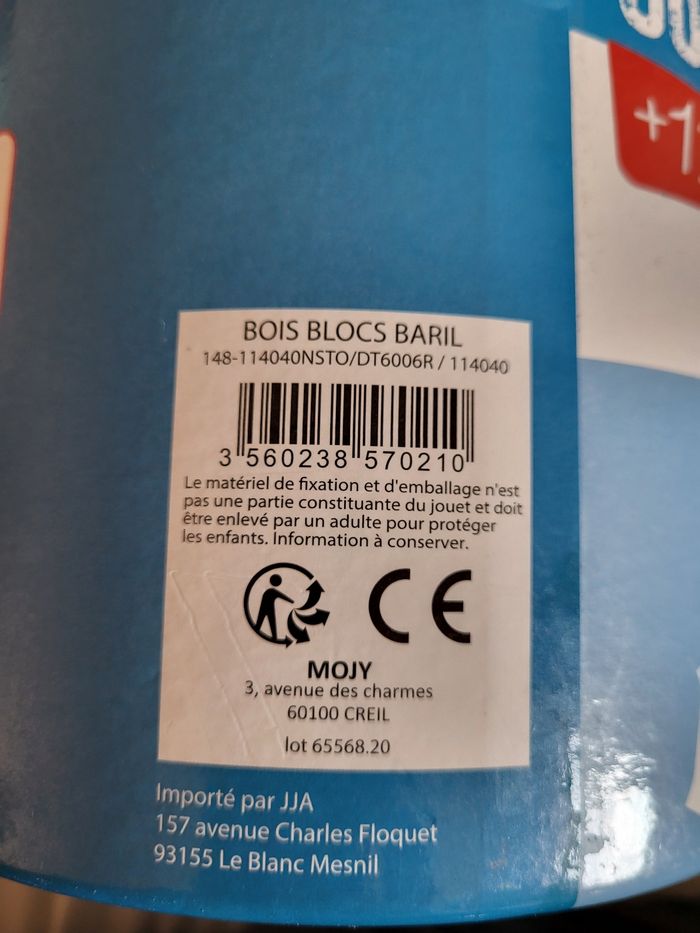Baril de 40 blocs en bois +12 mois quelques éclats de peinture sur certains blocs mais reste en très bon état