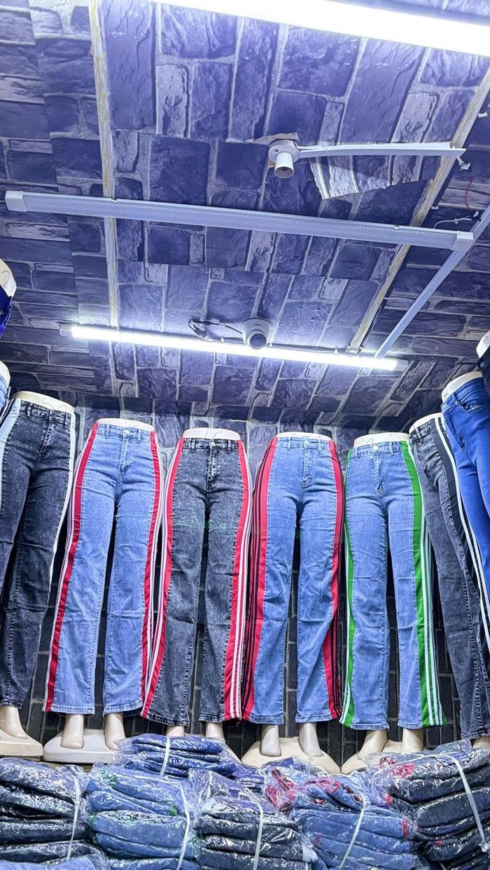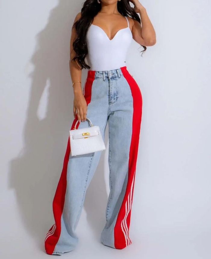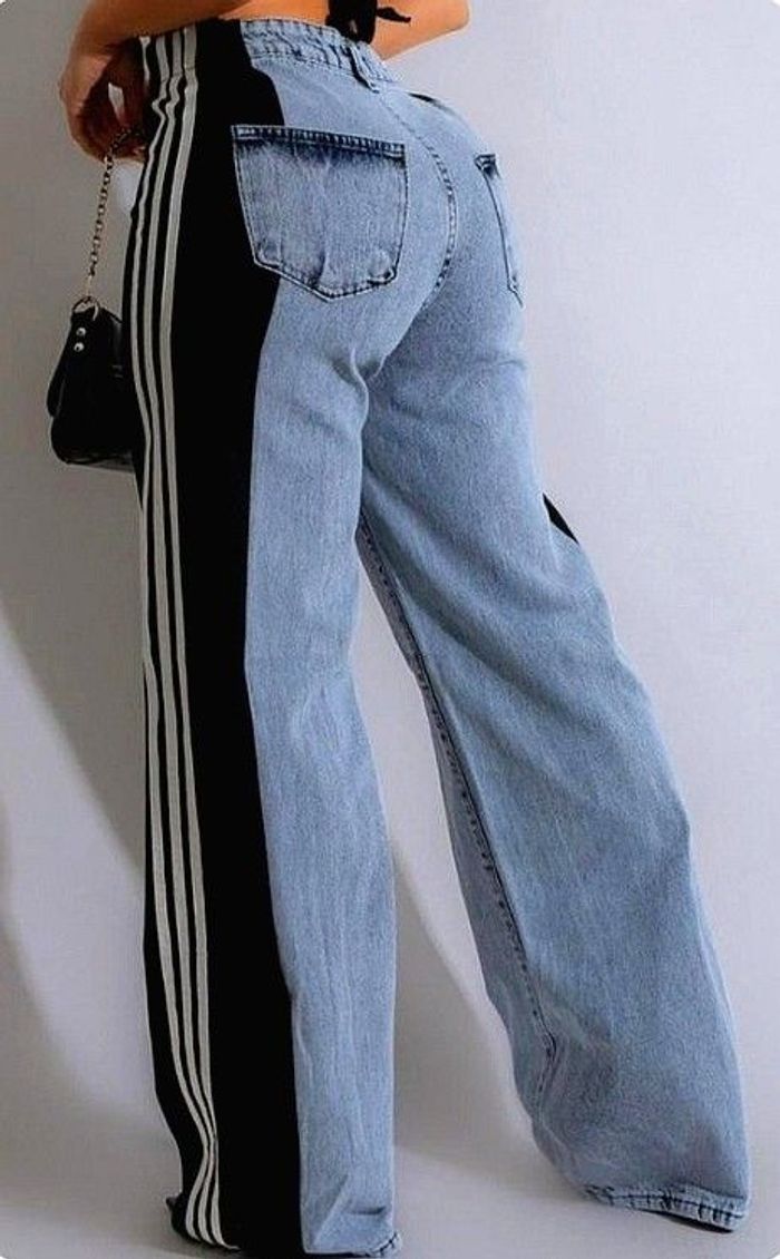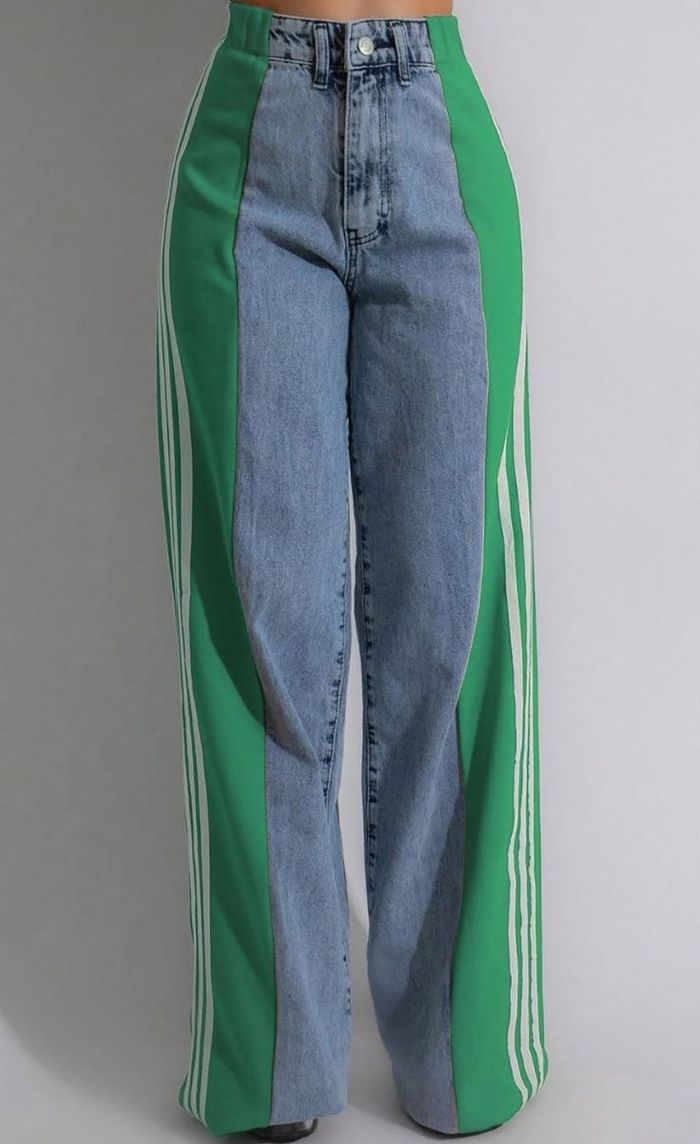 This is a pair off women patchwork striped denim pants with a high elastic waist and a wide-leg design.