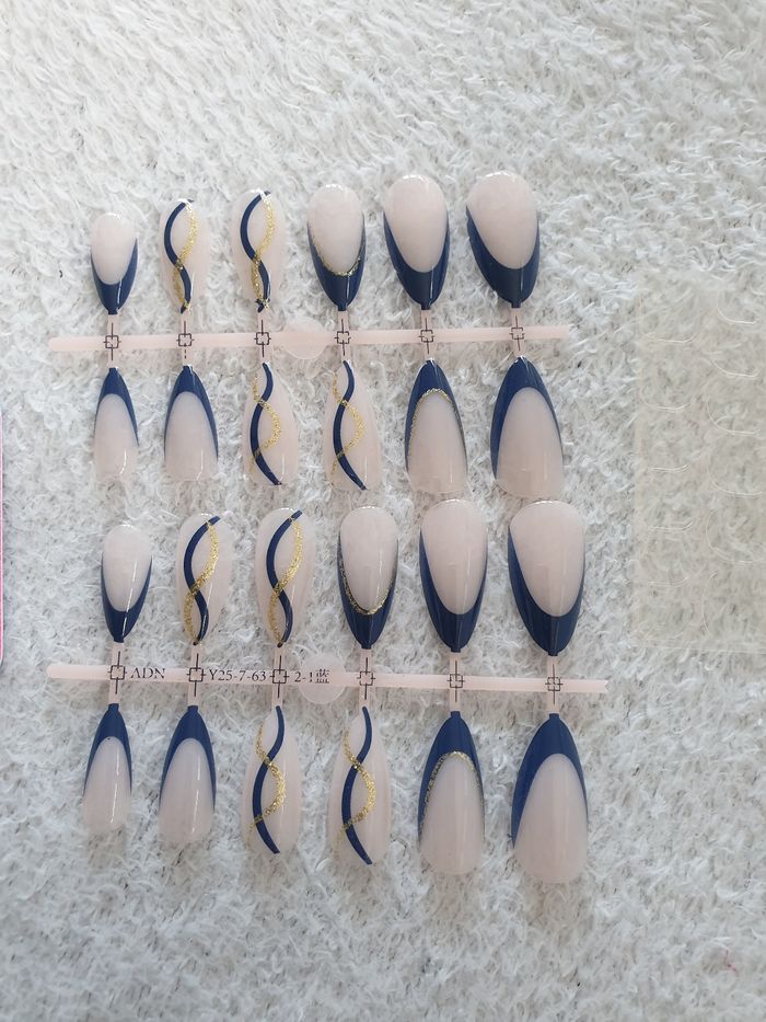 Ensemble de 24 faux ongles. Avec petites limes à ongles. Amovibles et réutilisables. Neufs Bleu et or, brillants.