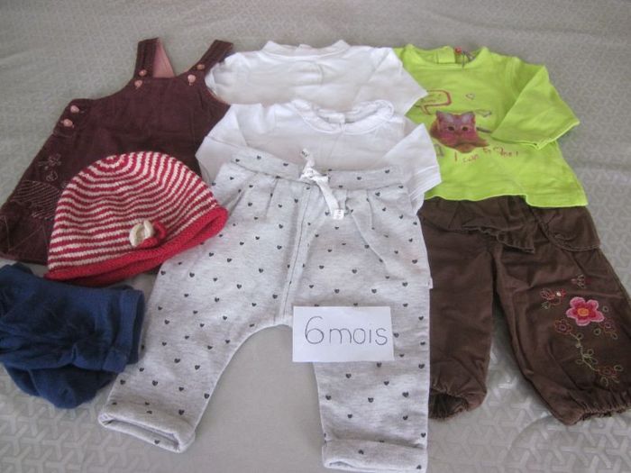 6m, robe salopette + 5 hauts ml + 4 pantalons + collants + bonnet offert, mini adélie, kiabi, tissaia, orchestra, kimbaloo, dpam, sergent major