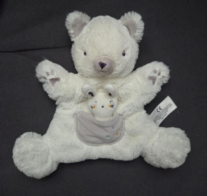 Doudou marionnette ours en velours fourrure de couleur blanc. Petite poche en velours de couleur grise sur le devant avec lapin .