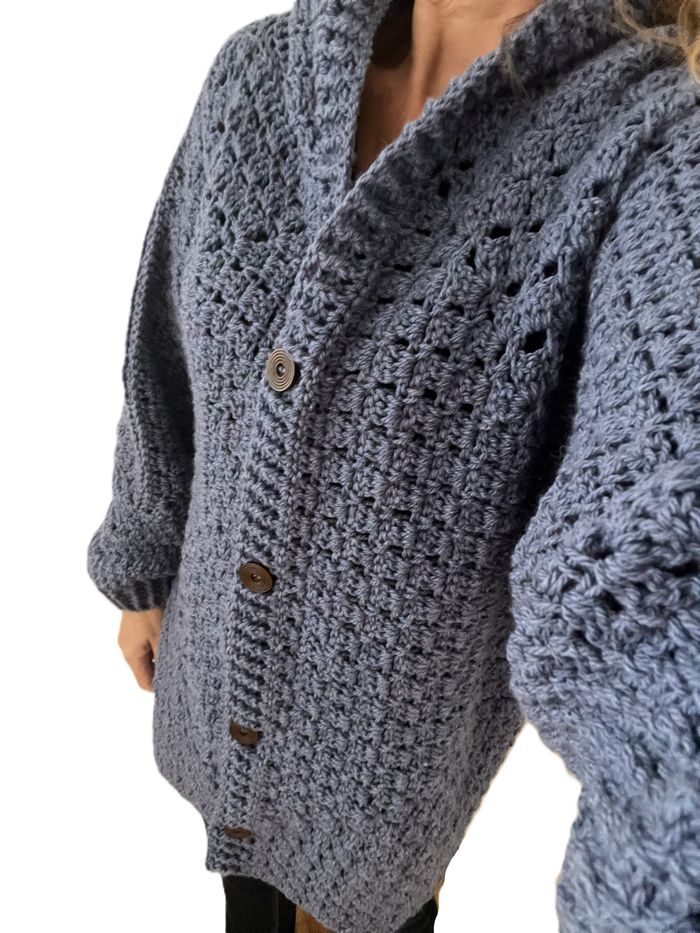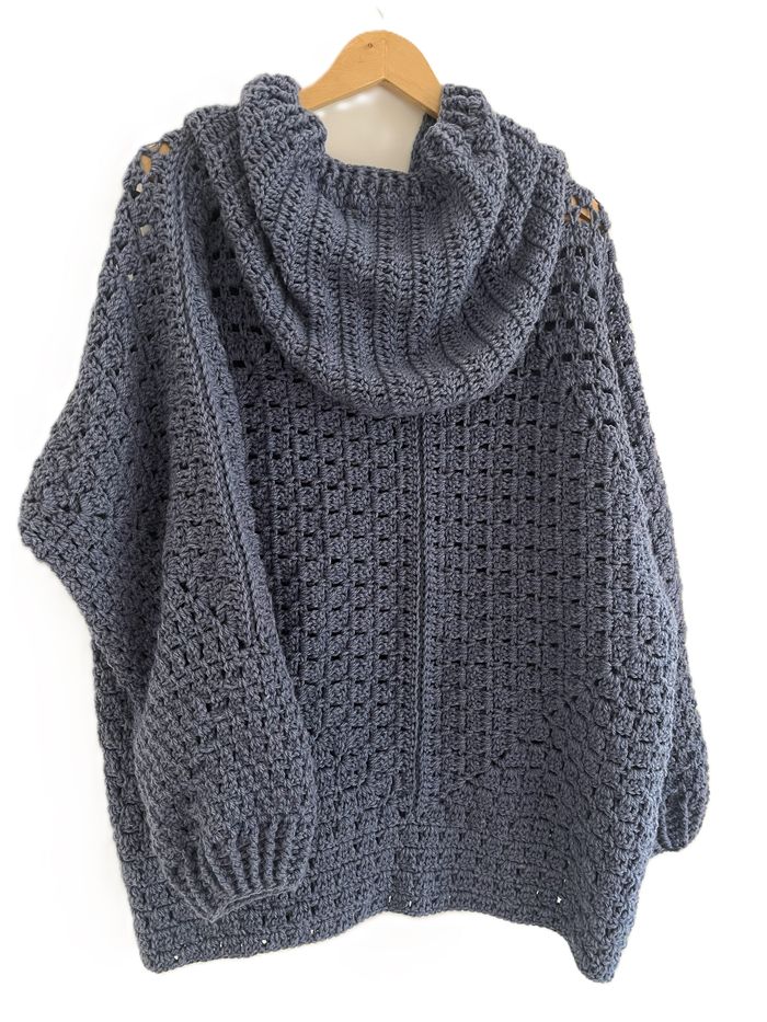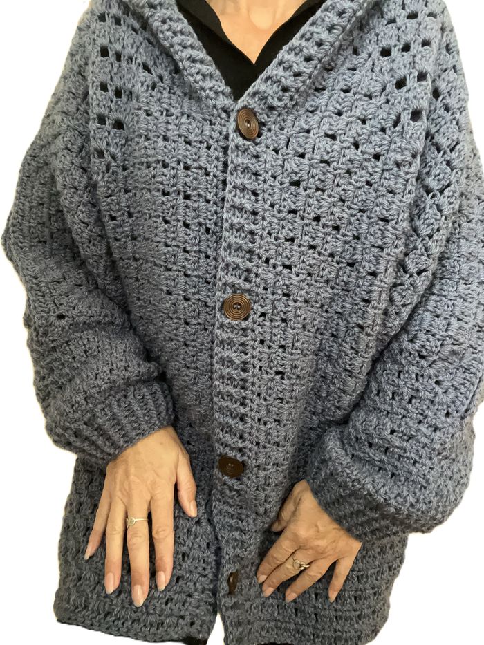 veste à capuche longue en acrylique au crochet bleu jean. fermeture par 4 boutons. taille L Mesures à plat : hauteur 65 cm (26 pouces) largeur 64 cm ( 25 pouces) longueur des manches (depuis le milieu du dos) 69 cm (31 pouces) idéal de la taille 40 à 42 disponible également en taille M et en bleu marine sur ma boutique