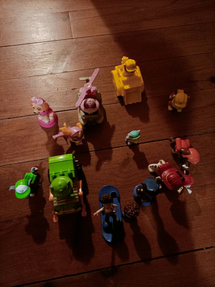 La boite est un peu abimée aux 2 coins supérieur. La pat 'patrouille se compose de: Ryder (2) Chase (1) Marcus (2) Rocky (2) Ruben (2) Stella (3)/ Zuma (1) Everest (1)