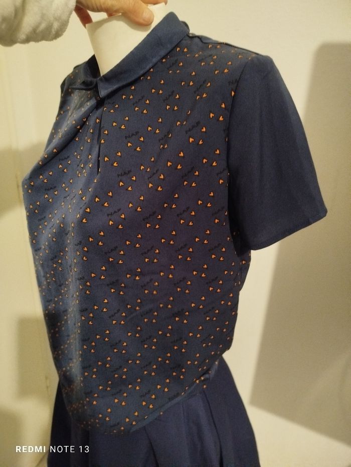 #kytie38femme. Blouse manches courtes taille 38 marine et moutarde mesure des épaules 40 cm des aisselles 42 cm hauteur 65 cm en état neuf dégriffés ref 907
