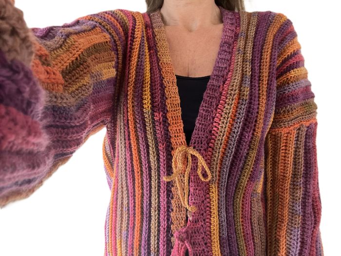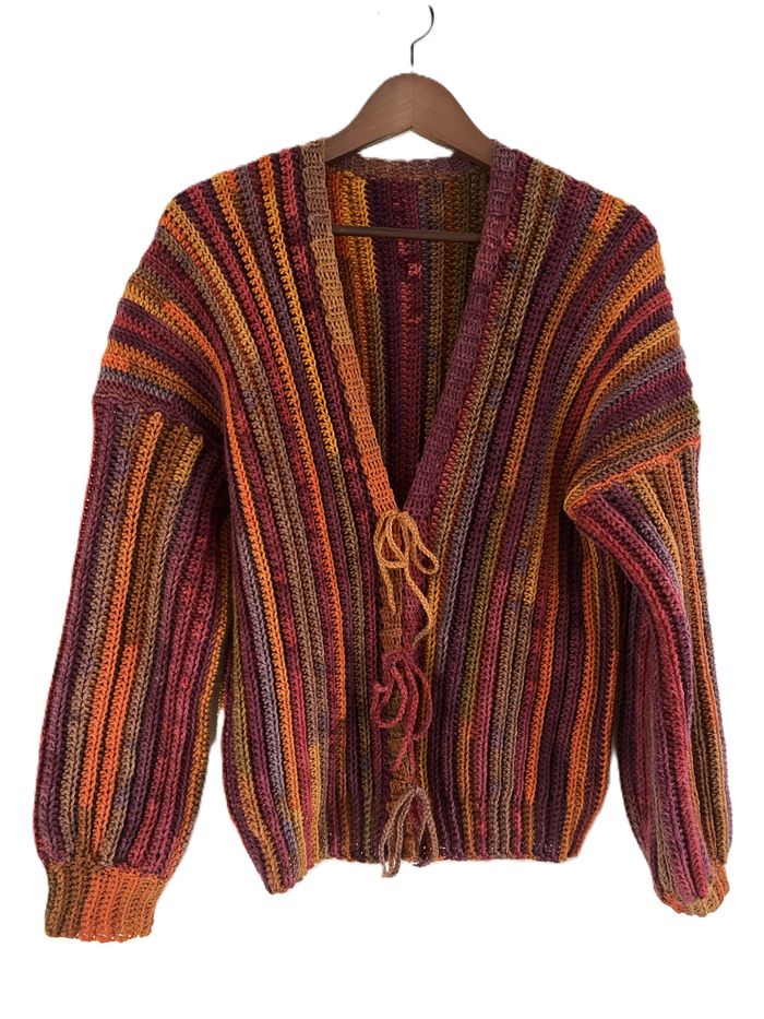 Gilet cardigan réalisé au crochet. Très doux et chaud avec son aspect maille boulettes bohème il ajoutera une touche tendance à toutes vos tenues. les liens pour la fermeture de la veste sont amovibles et peuvent être enlevés ou positionner à différents endroits. Multicolore taille M : Hauteur 57 cm largeur 57 cm