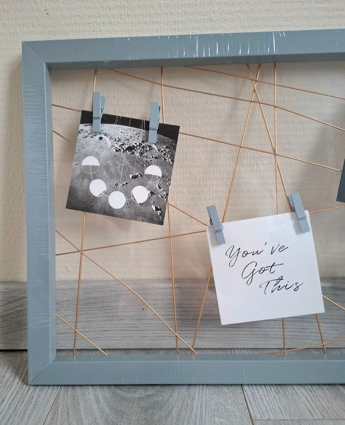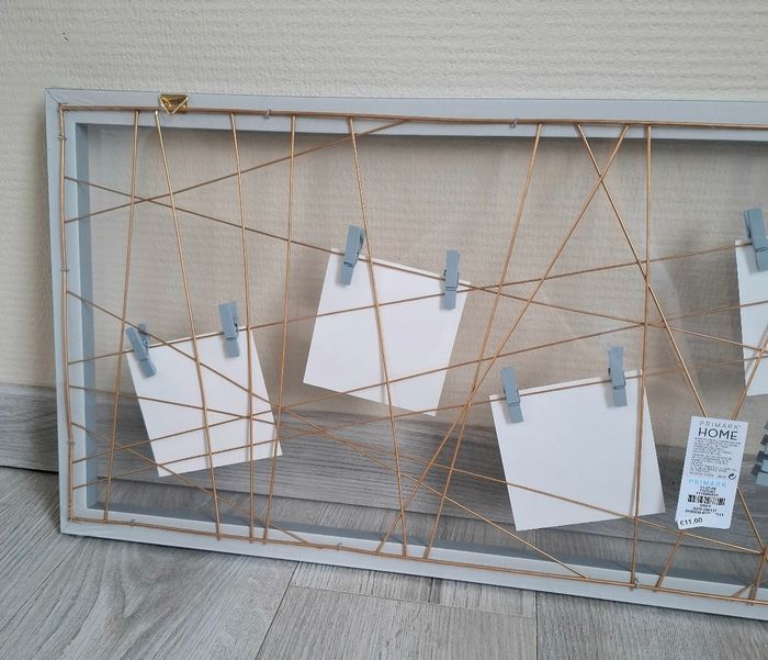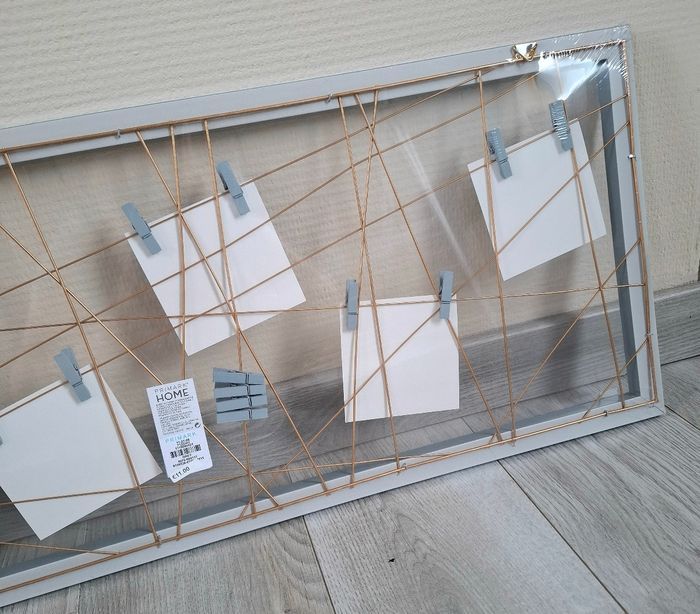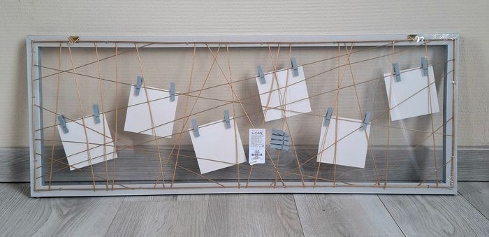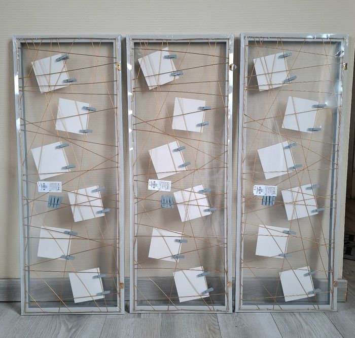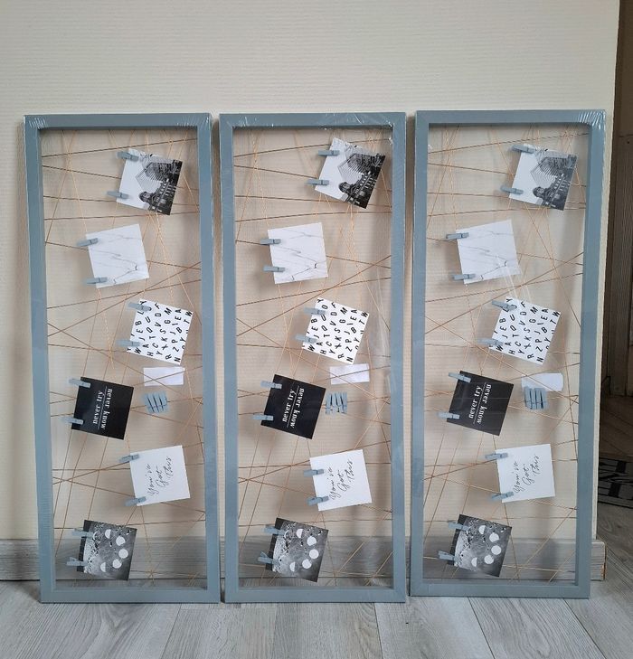 Je vends un lot de 3 cadres photo venant de chez Primark. Ils sont de couleur gris avec du doré. Ils mesurent 30 cm de hauteur - 80 cm de largeur et 1,5 cm de profondeur. Prix neuf : 11€ pièces. Neuf, encore emballer (Attention : l'emballage peut-être ouvert à certains endroits - voir photos).