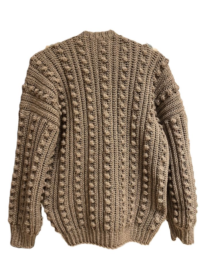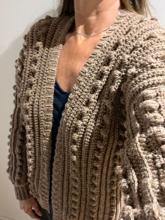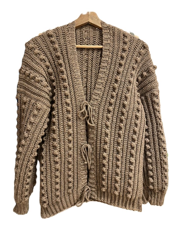 cardigan réalisé au crochet. Très doux et chaud avec son aspect maille boulettes bohème il ajoutera une touche tendance à toutes vos tenues. les liens pour la fermeture de la veste sont amovibles et peuvent être enlevés ou positionner à différents endroits. Couleur Camel Version longue Taille M : Hauteur 65 cm largeur 55 cm