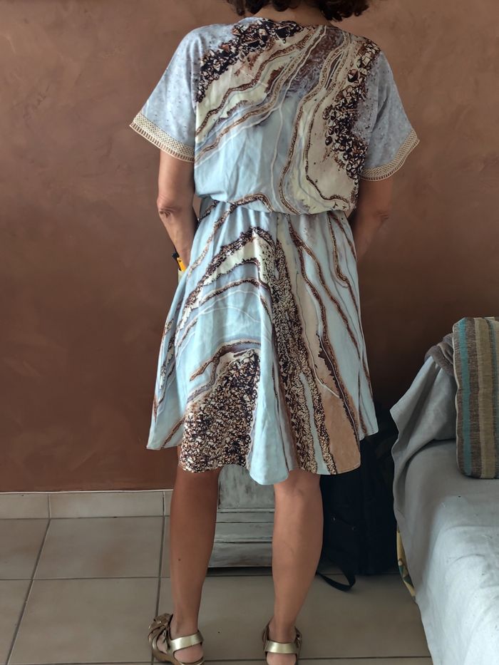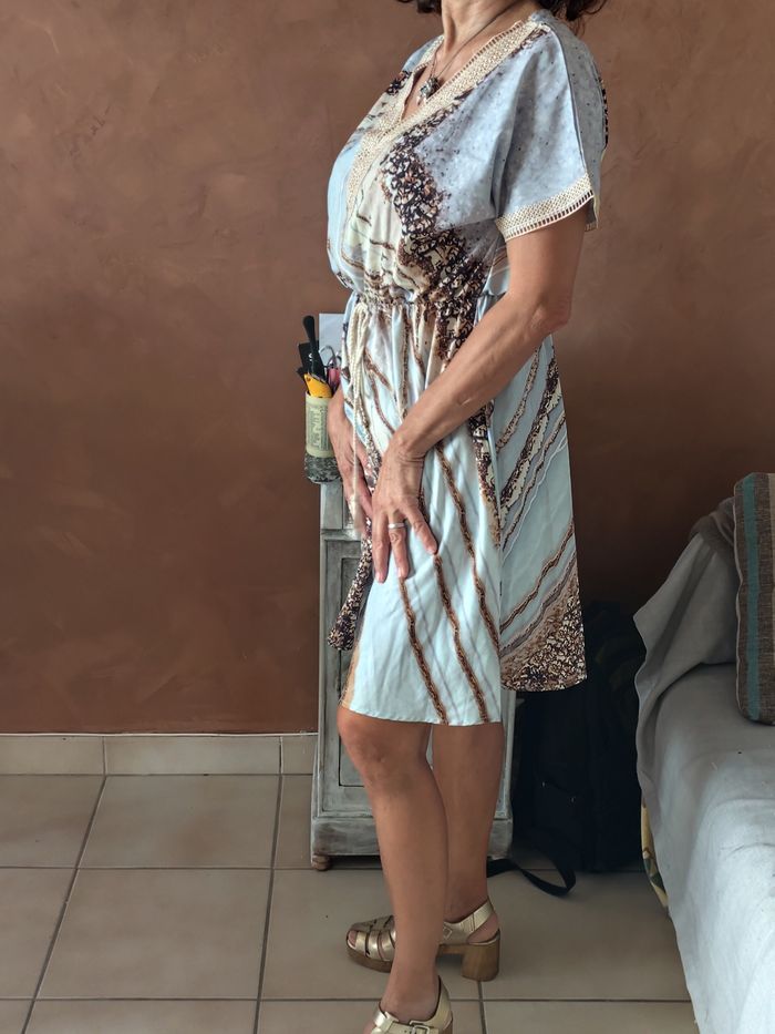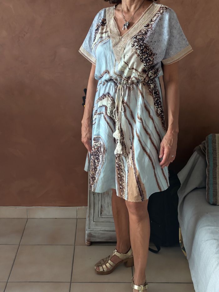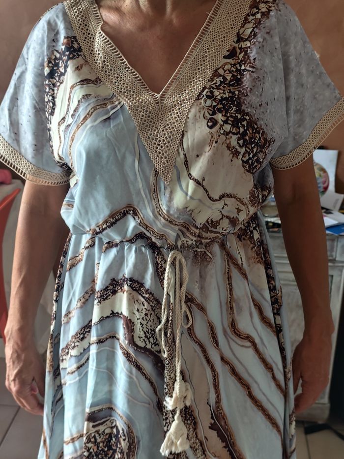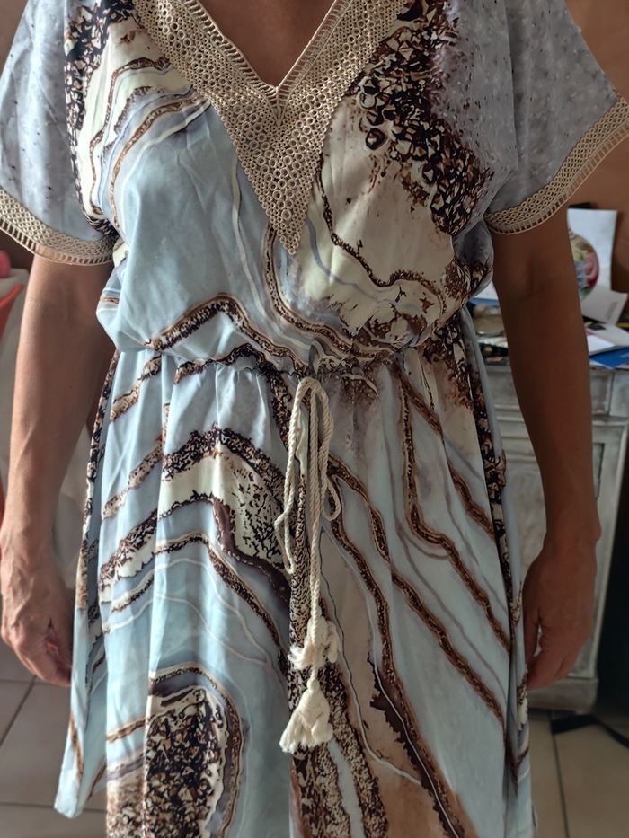 Jolie robe avec une ceinture intégrée blanche et marron largeur 42 cm.longueur 95