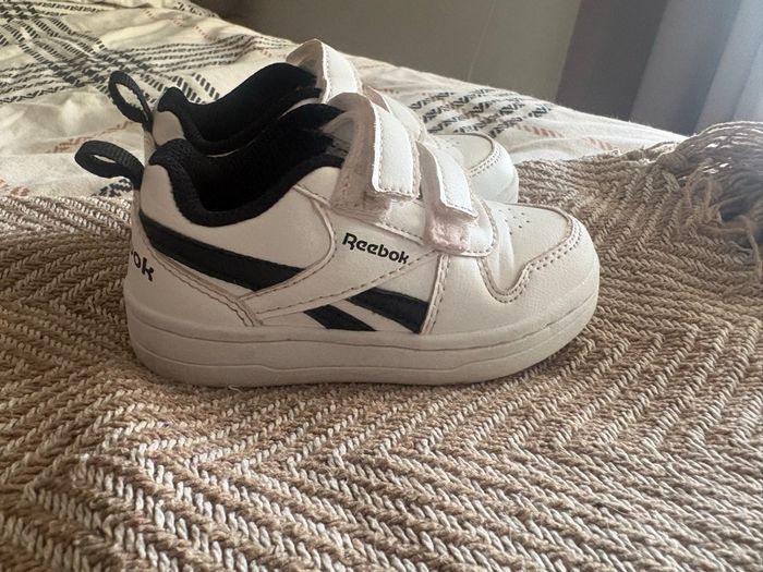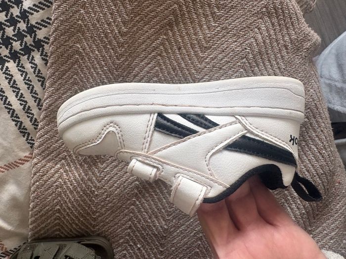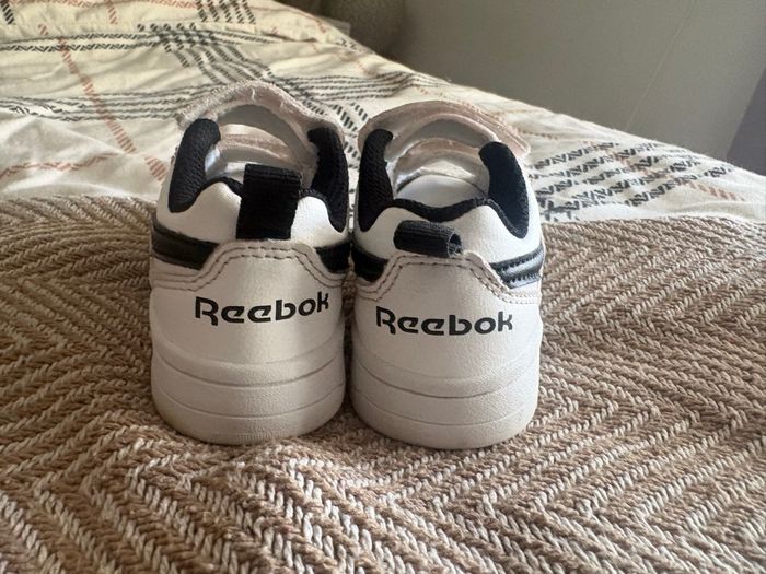 Une. Paire de Reebok garçon. Blanche et noir. Bon état scratch, ouverture devant décolorer en rose, pal à cause d’un lavage.( Scratch.) voir les photos. Taille 23
