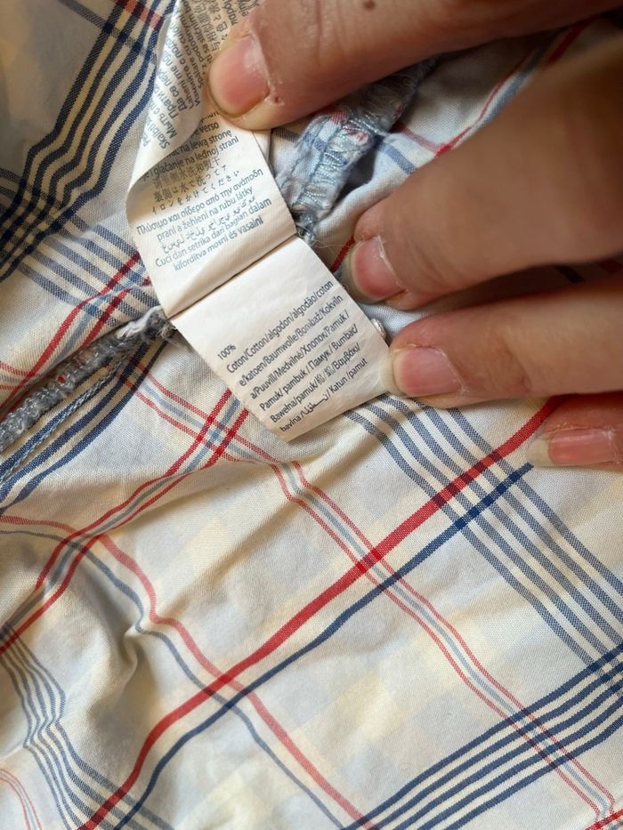 vends cette chemise manches courtes à carreaux couleur blanc, bleu, rouge marque Okaïdi taille trois ans ou 94 cm 100 % coton demie largeur aux aisselles 33 cm longueur 41 cm 2 euros Mes autres annonces de vêtement pour garçons de 2 à 3 ans #lma42garcon2 #lma42garcon3
