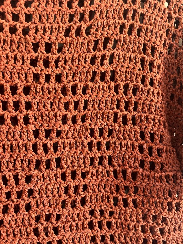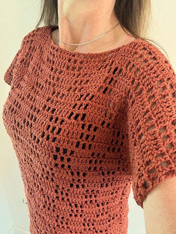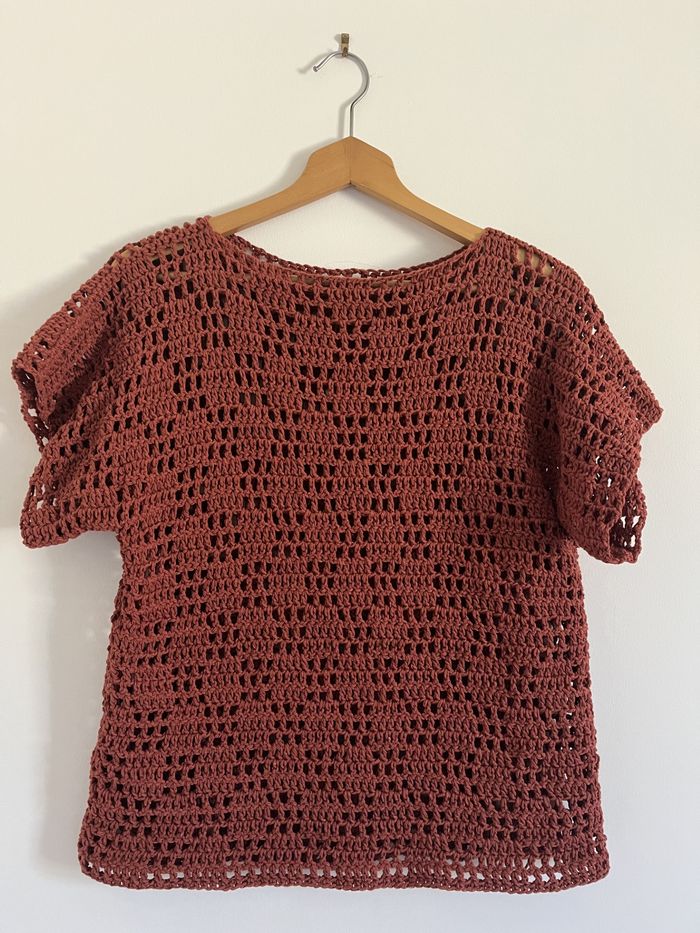 pull au crochet fait à la main avec motifs ajouré identiques devant et dos, manches courtes en coton et acrylique, idéal pour une taille S pour un style oversize ou M pour une coupe plus ajustée comme sur le modèle. coton et acrylique Mesures à plat : hauteur 61 cm (24 pouces) largeur 48 cm (19 pouces) tour de poitrine 96 cm (38 pouces)