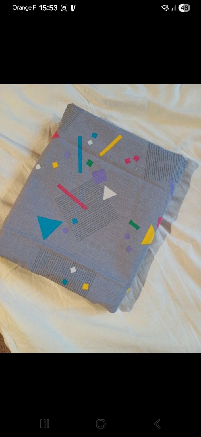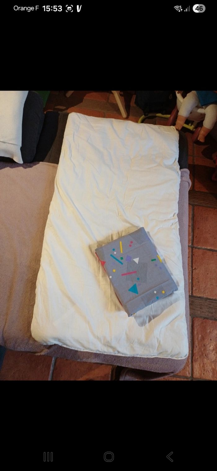 Ensemble avec une couette de dimensions 60 / 120 cm et housse faite maison avec emplacement pour la couette et tissu qui déborde pour tomber sur le côté du lit ( 92 / 143 cm )