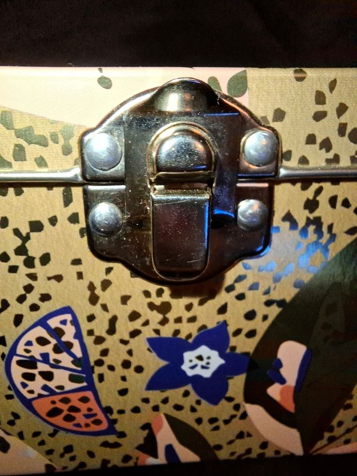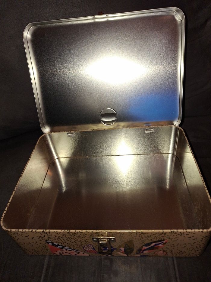 Vends superbe boîte de rangement en métal de la marque Lipton. Elle se distingue par son design contemporain aux motifs de feuilles et de fruits (grenade, citron) sur un fond beige moucheté très élégant. ​Matériau : Métal (fer-blanc), robuste et léger. ​Fermeture : Crochet métallique sécurisé en façade. ​État : Excellent état, intérieur très propre (voir photos). ​Utilisation : Parfaite pour conserver vos sachets de thé, mais aussi comme boîte à bijoux, vide-poche ou boîte à couture décorative.