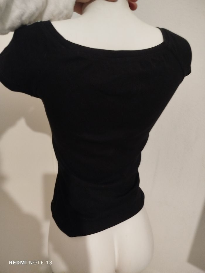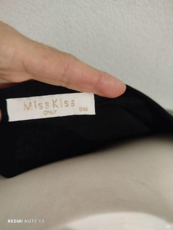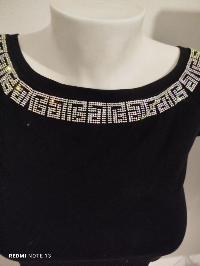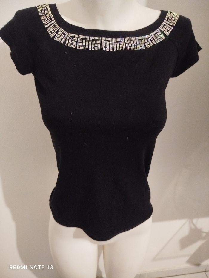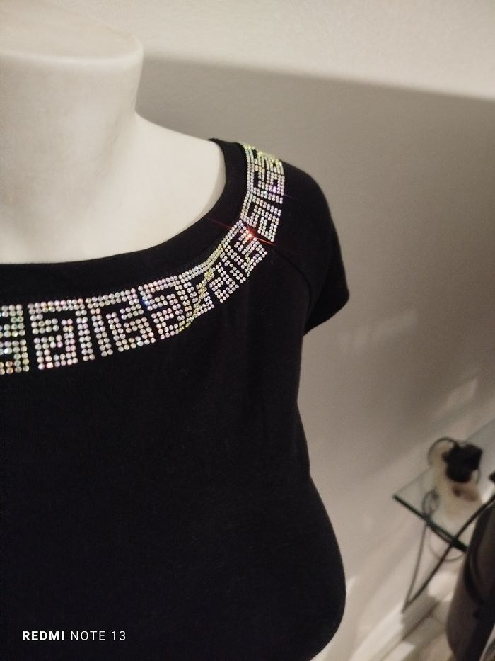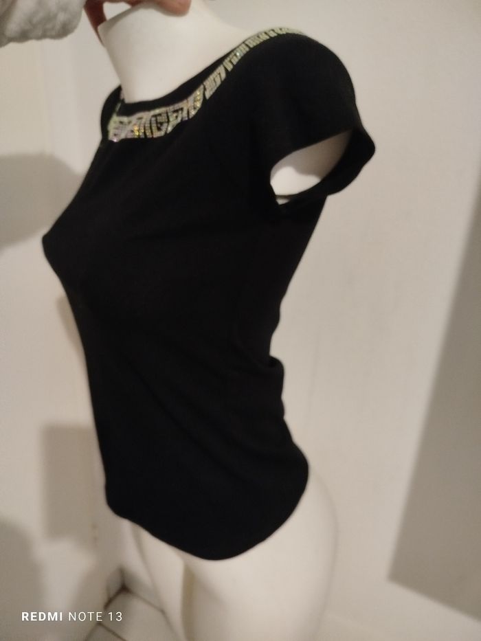 #kytieSfemme. Tee-shirt manches courtes taille S col rond strass de marque Miss Kiss en état neuf noir mesure des épaules 38 cm des aisselles 38 cm hauteur 60 cm 95 % coton 5 % élastique réf 409
