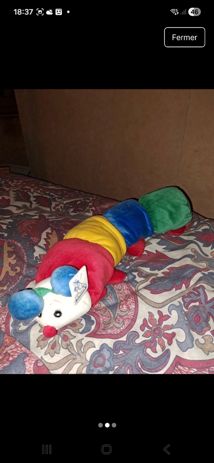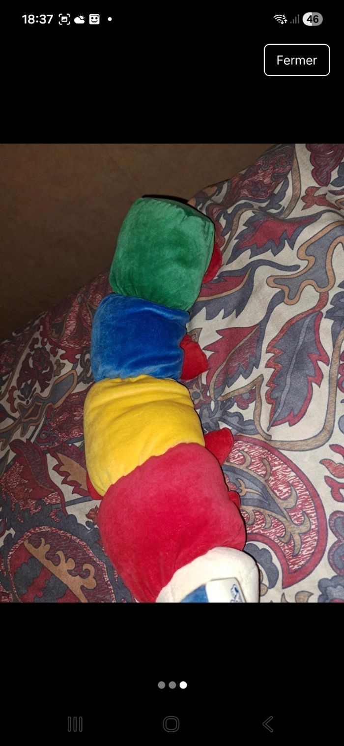 Vends une grande peluche chenille multicolore de la marque Maxita, parfaite pour l'éveil sensoriel des bébés ou pour une décoration de chambre colorée. ​État : Neuf avec étiquette d'origine. ​Dimensions : Belle longueur d'environ 54 cm. ​Fonctions d'éveil : ​Pouic-pouic intégré dans la tête (s'active par pression) pour amuser bébé. ​Hochet sonore (grelot) situé dans la partie verte à l'extrémité. ​Design : Couleurs primaires vives (rouge, jaune, bleu, vert) et texture velours très douce. ​Détails : Yeux brodés pour plus de sécurité. ​Article très propre, issu d'un environnement non-fumeur. Idéal pour un cadeau de naissance !