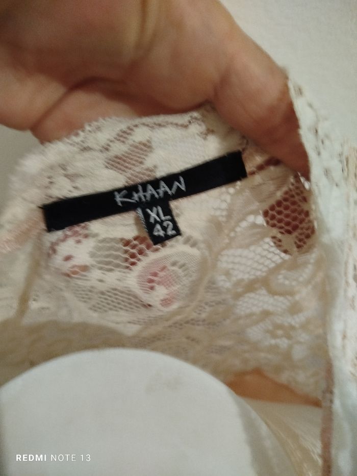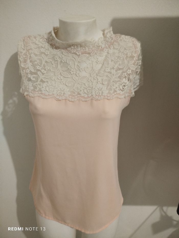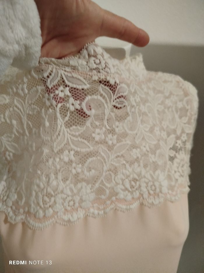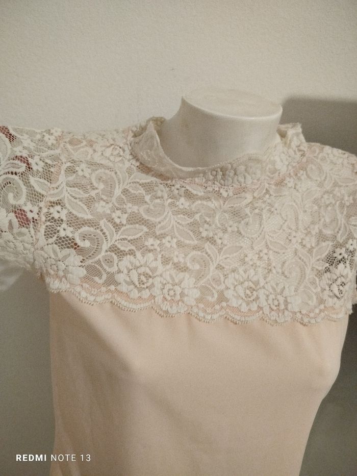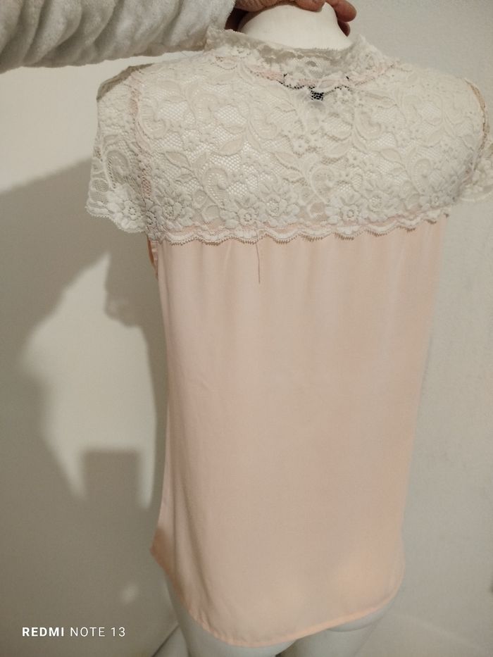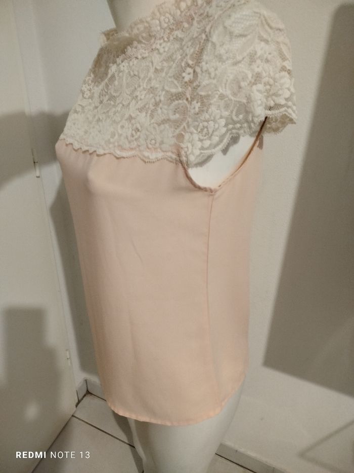 #kytieXLfemme. Tunique blouse taille XL alors élastique et en dentelle sur le col et sur les manches en polyester en état neuf mesure des épaules 42 cm des aisselles 48 cm la hauteur et de 70 cm de couleur saumon clair on voit le fluide ref 422