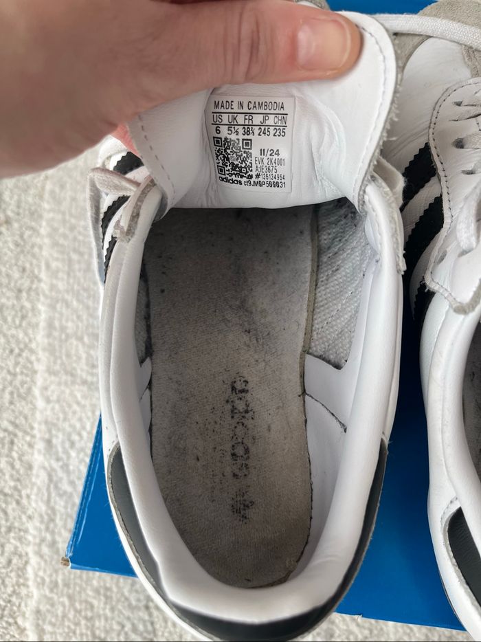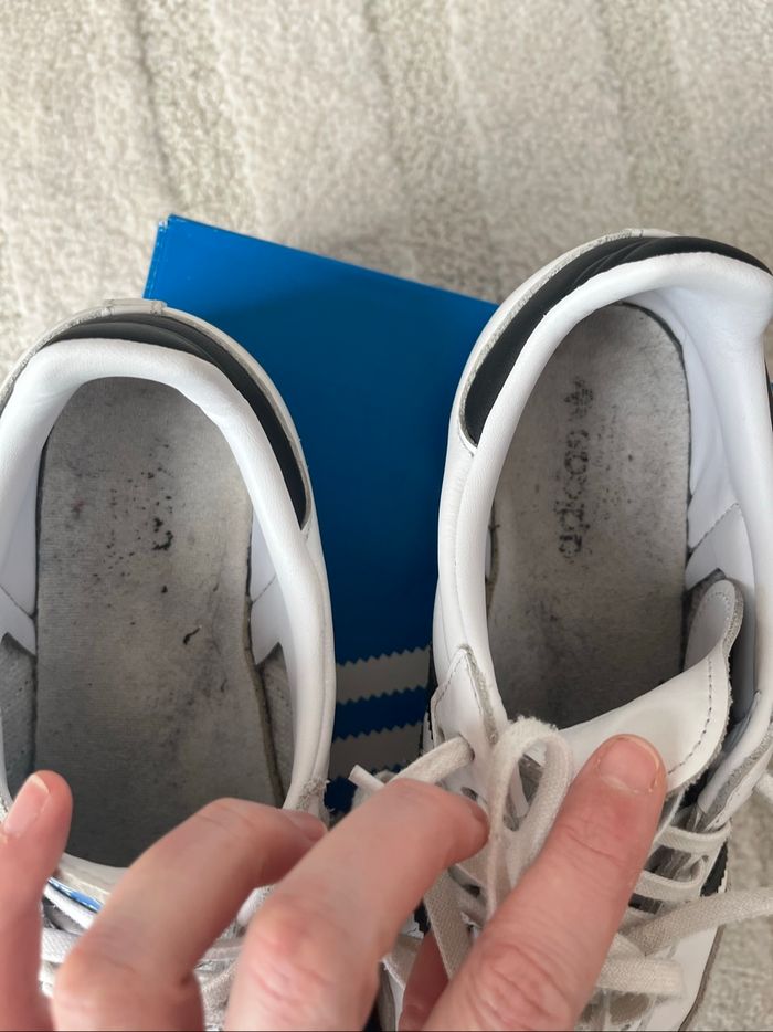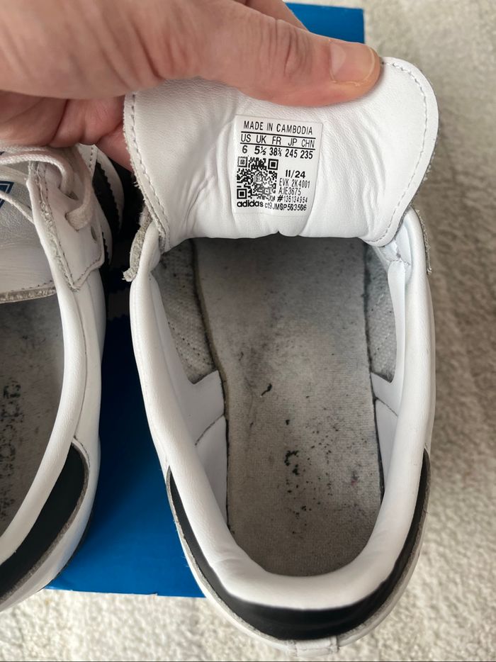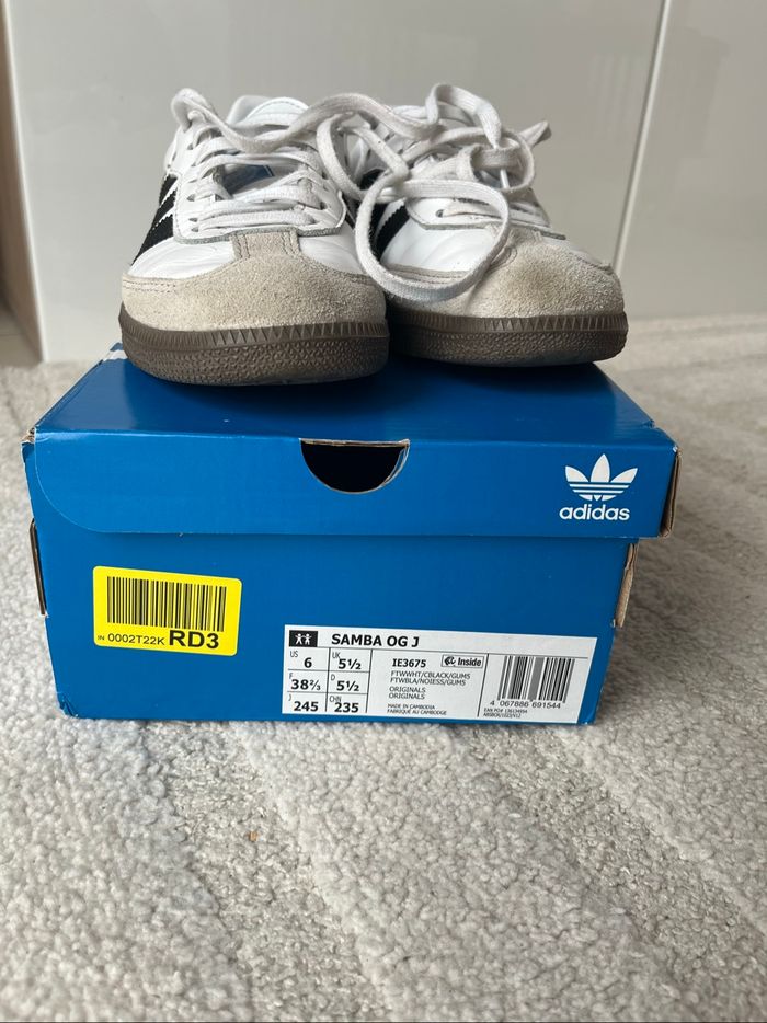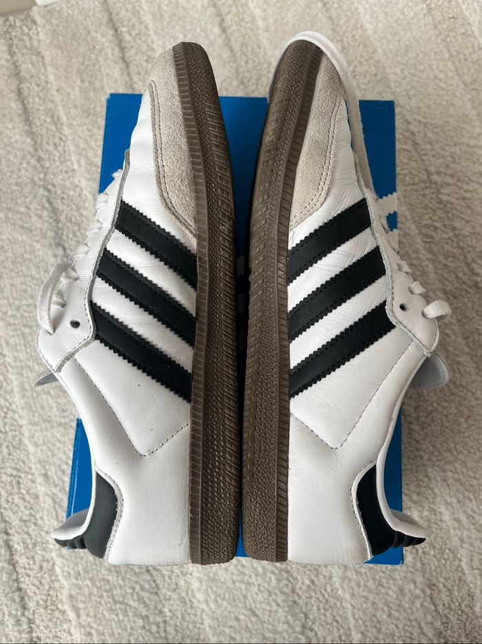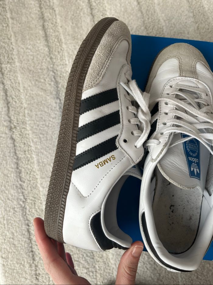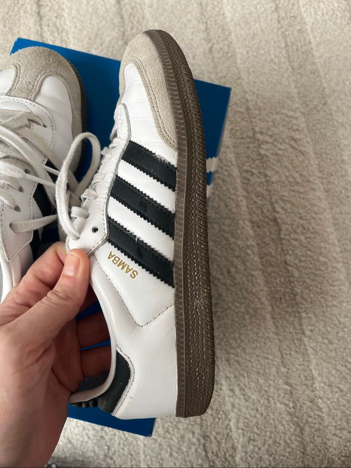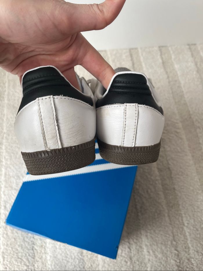 Je vends cette paire d’adidas samba OG Taille 38 2/3 Achetées l’année dernière Portées quelques fois. Tache sur le « velours » beige sur le devant de gras que je n’ai pas spécialement essayé de retirer Cuir un peu plissé sur une des chaussures au talon Écriture partie à l’intérieur des deux chaussures Envoyées dans la boîte Il y a quelques imperfections mais elle reste en très bon état