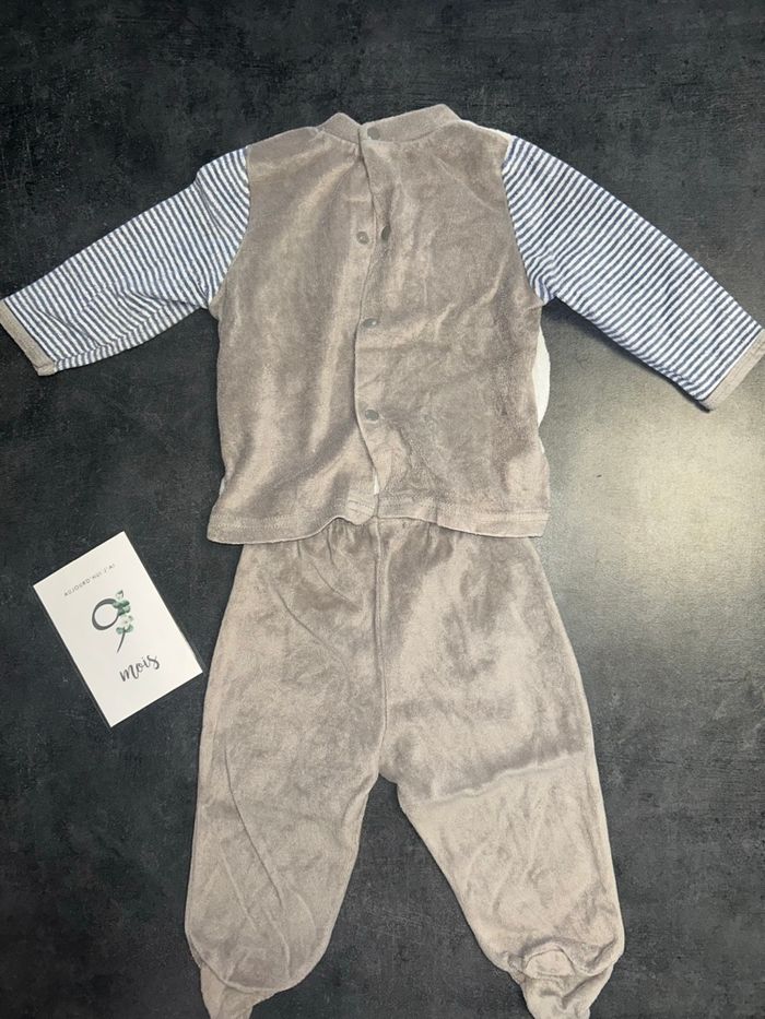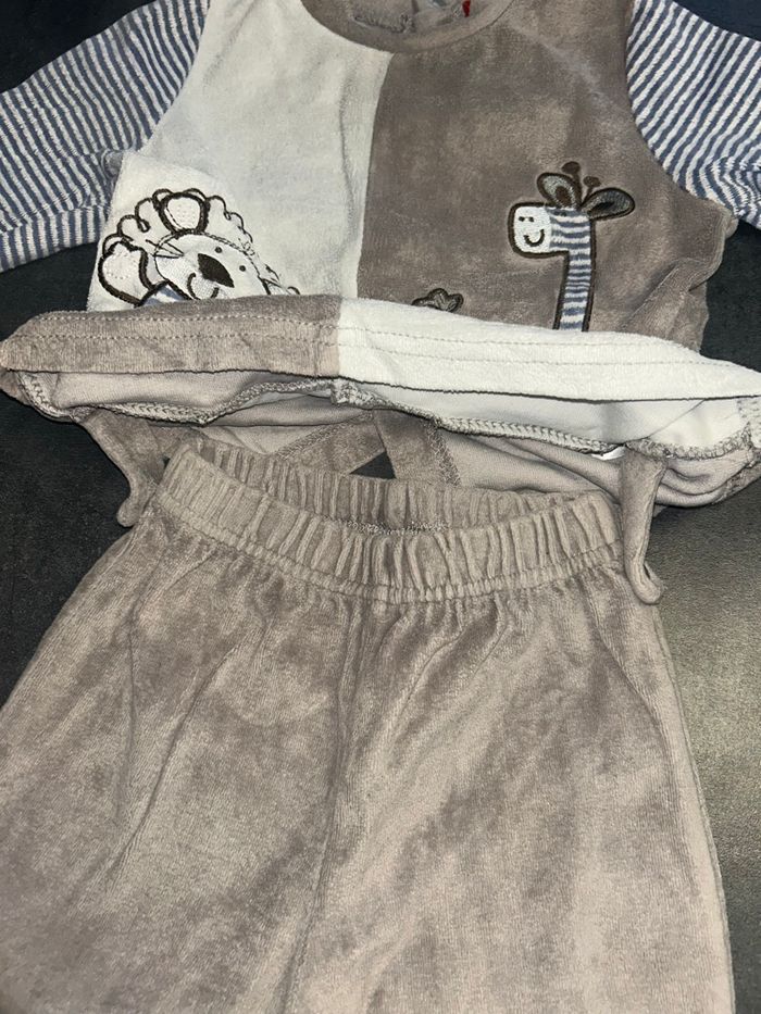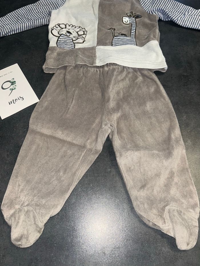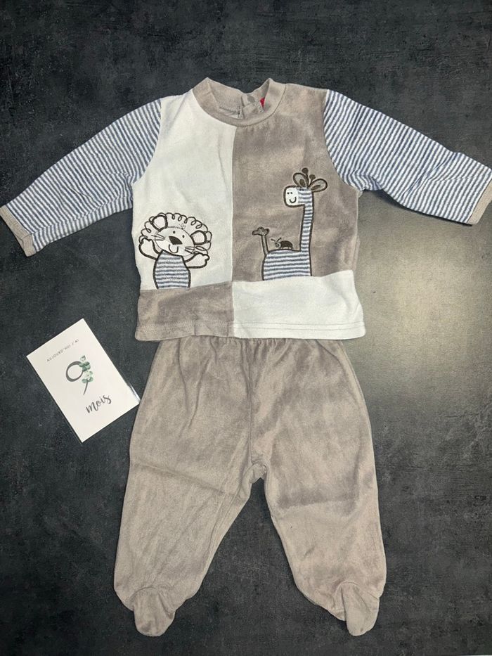 Pyjama bébé 2 pièces avec pieds Couleur gris Motif lion et girafe Ouverture dans le dos par pressions Le haut et le bas s’attache à la taille Taille : 9 mois/69 - 72 cm Mixte : peut convenir à une petite fille ou à un petit garçon