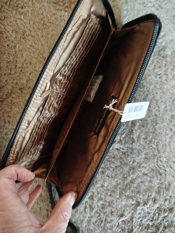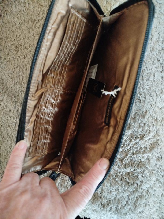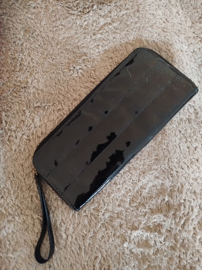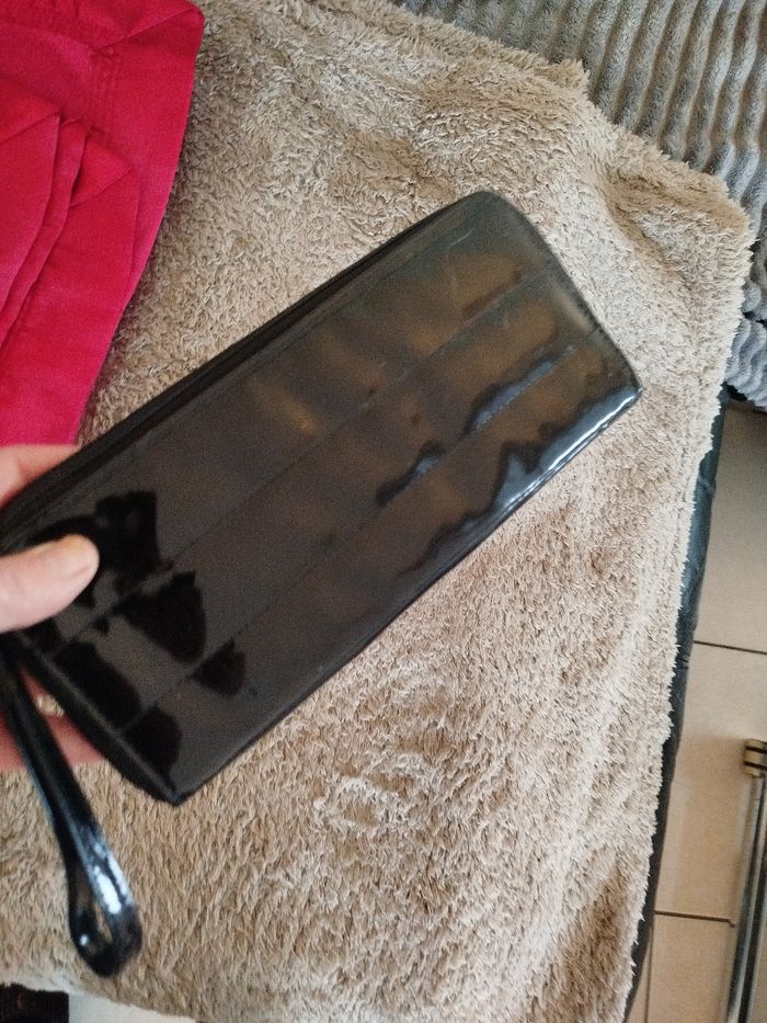 Bonjour magnifique Porte monnaie et carte avec anse de couleur noir vernis et intérieur mordoré. Dimensions de 23 x 10 cm. Activation sur les lots