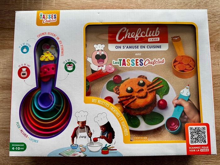 Coffret Kids : Cuisine avec les tasses Chefclub Le premier coffret Chefclub Kids invite les enfants en cuisine ! Vos enfants vont s'amuser à réaliser des recettes ludiques en autonomie grâce au système innovant de tasses à mesurer. Les recettes illustrées en pas-à-pas et faciles à suivre éveilleront leurs papilles et leur imaginaire. Ils retrouveront aussi la vidéo de la recette avec les QR codes pour encore plus d'inspiration. En leur donnant l'envie et les outils pour cuisiner en autonomie, vos enfants vont maintenant manger de tout, même des légumes ! Coffret neuf, jamais déballé ! Remise en main propre sur Tinqueux, paiement en espèces ou envoi possible.
