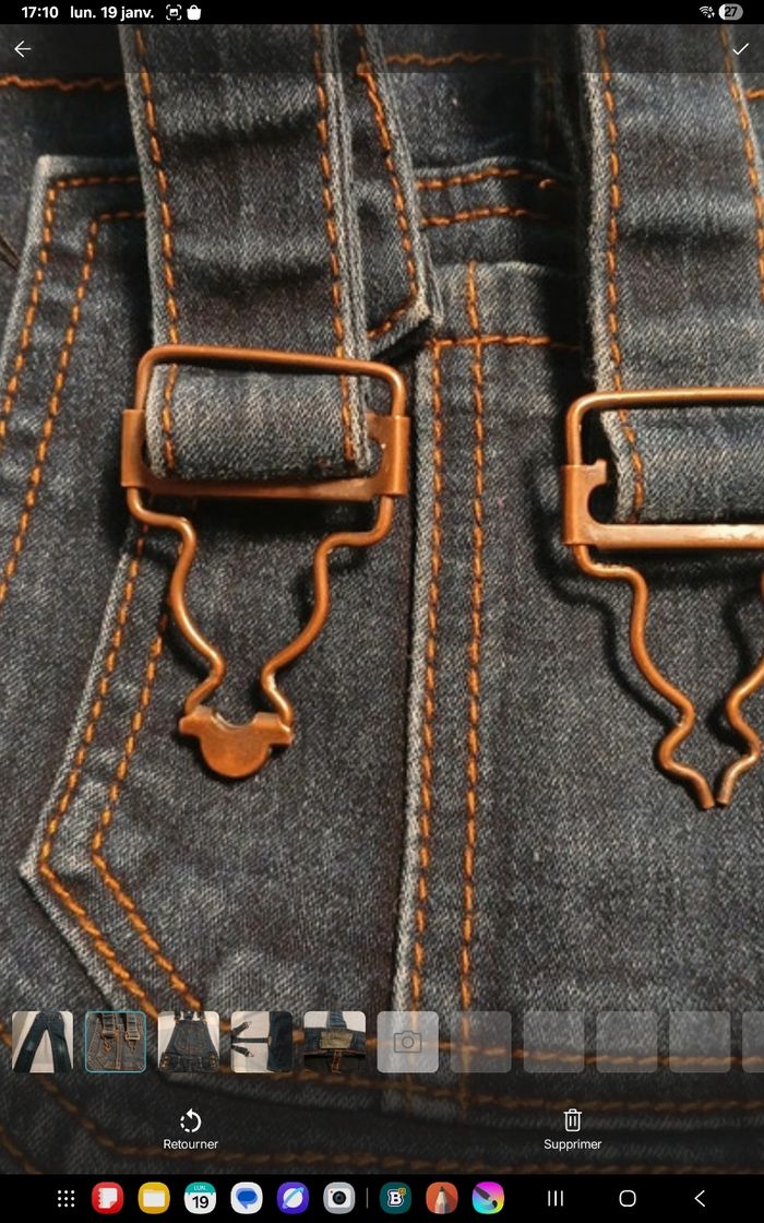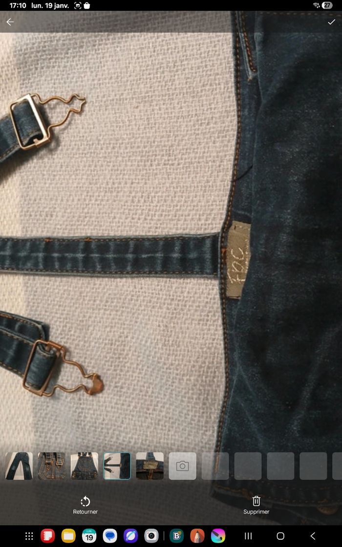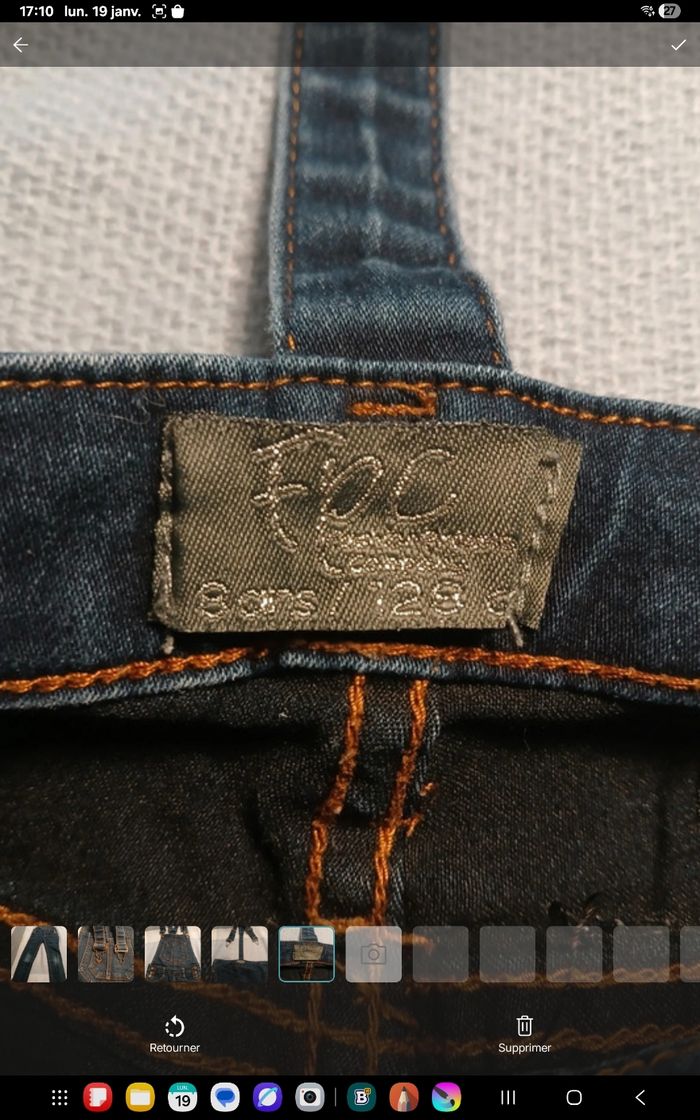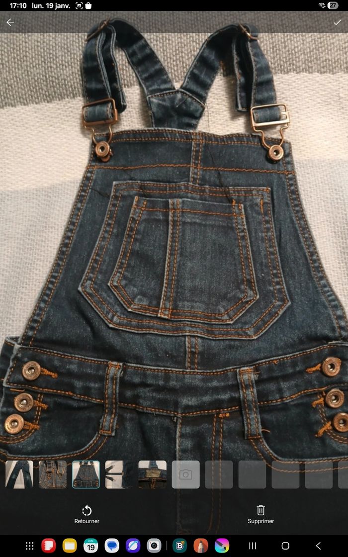Salopette slim FPC 8ans bleu foncé brut stretch attache abîmé mais ne se vois pas du tout et tiens très bien quand même voir photo 8 ans