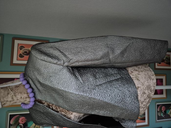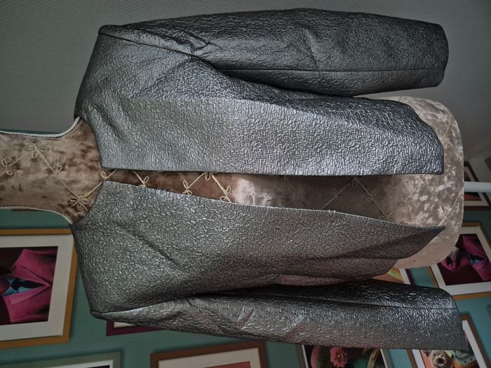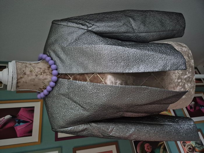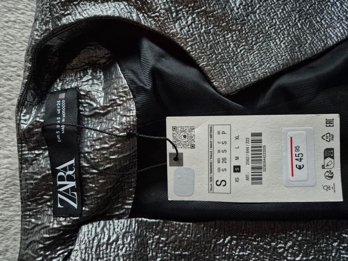 Veste / blazer court de la marque Zara. Neuf, encore avec son étiquette. Coloris = argenté. Taille = S (peut convenir jusqu'au 38, voir mesures plus bas). 2 fausses poches. Fermeture par crochets. Composition = 80% polyester, 20% fibre métallisée en polyester, doublure 100% acétate. Fabriqué au Maroc. Mesures à plat = Largeur aux épaules = 41cm environ. Largeur aux aisselles = 48cm environ. Longueur = 48cm environ. Longueur de la manche = 57cm environ. N'hésitez pas à me contacter si vous avez des questions. Je vous répondrai dès que possible.
