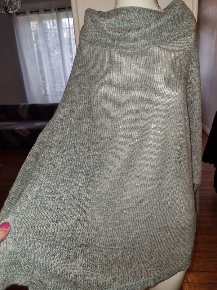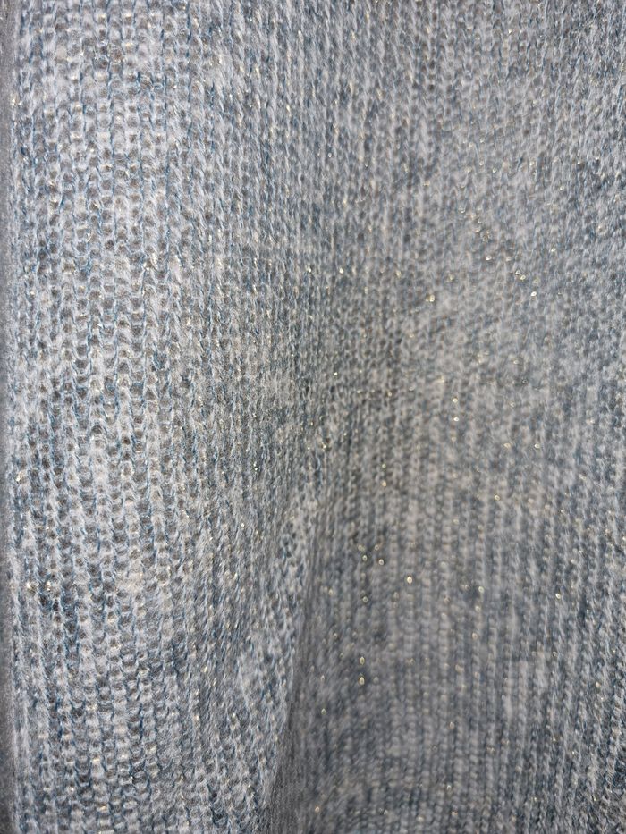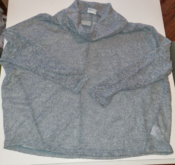 Pull Oversize Laura Torelli Taille 46/48 mais taille très grand, voir les mesures en suivant. Tissu fin, à porter avec quelque chose en dessous, voir photos. Large col. Coloris gris bleu avec fils métallisés. 56% Polyester, 41% Acrylique, 3% fibres métal. Dimensions à plat : épaules 94cm, aisselles 90cm, longueur 66cm. Neuf jamais porté.