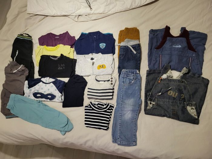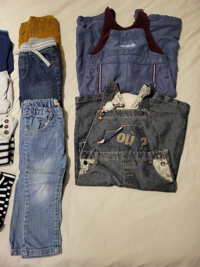 Lot comprenant 2 salopettes, 2 cols roulés, un pyjama 2 pièces, un pull, 3 pantalons, 3 t shirt manches longues, deux vestes zippées, 2 joggings