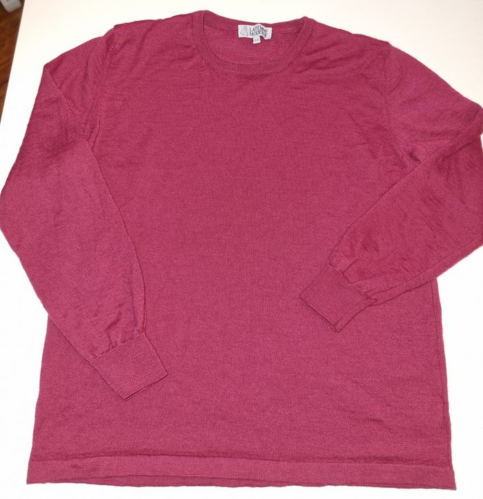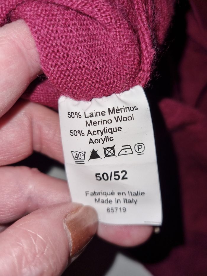 Pull La Femme Moderne Coloris rouge bordeaux Taille 50/52 mais taille petit, voir les dimensions à plat en suivant : Épaule à épaule : 44cm Aisselle à aisselle : 54 cm Longueur : 61 cm 50% laine mérinos 50% Acrylique Excellent état, jamais porté mais lavé.