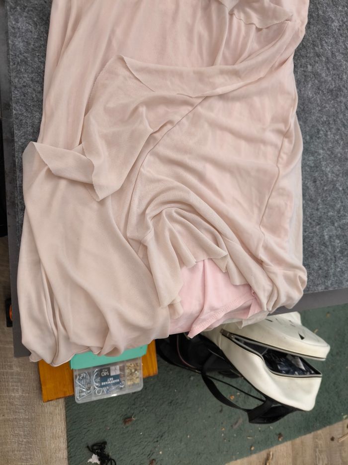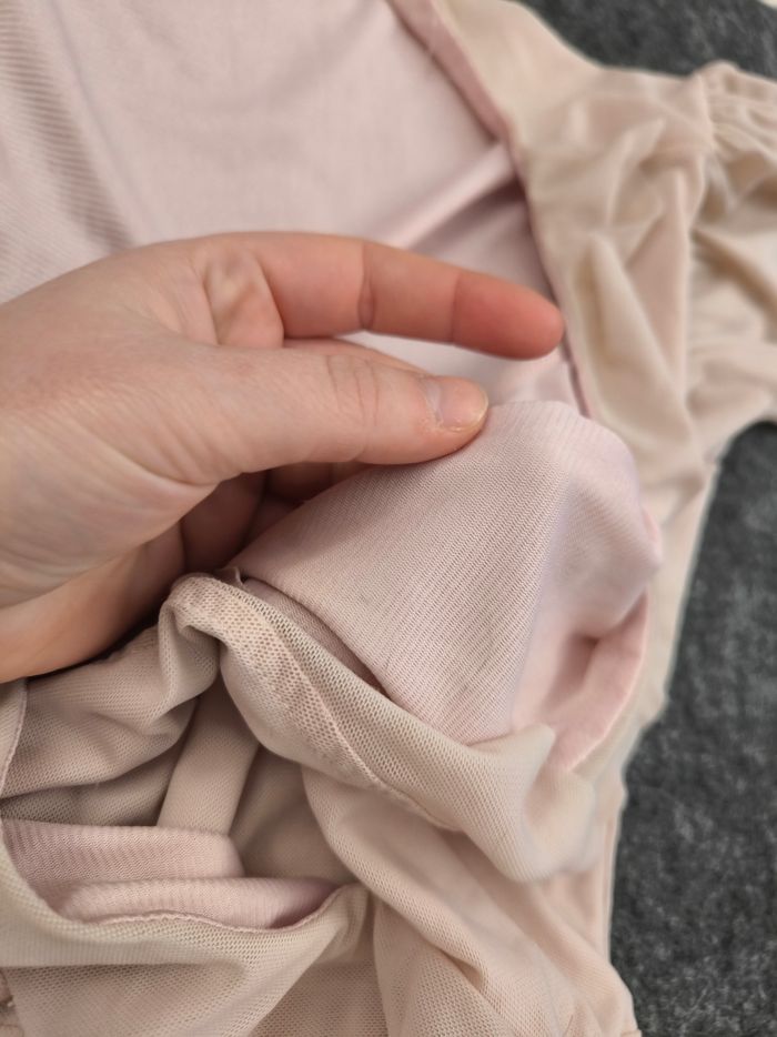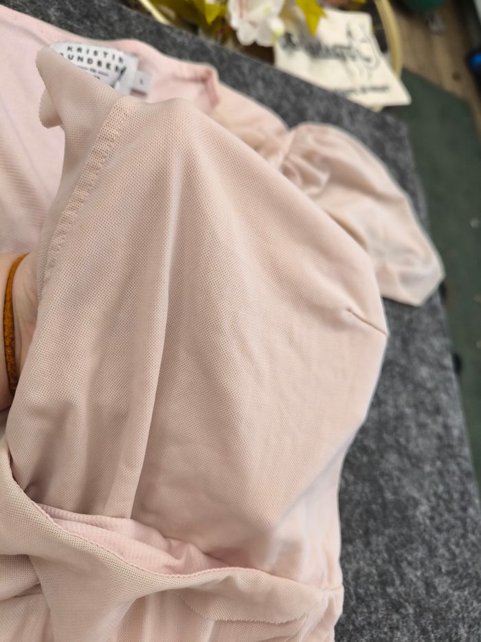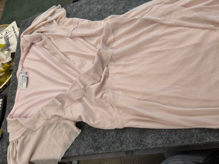 Robe manches courtes, au-dessus des genoux rose. Un voilage et une doublure. Pas transparente. Décolleté